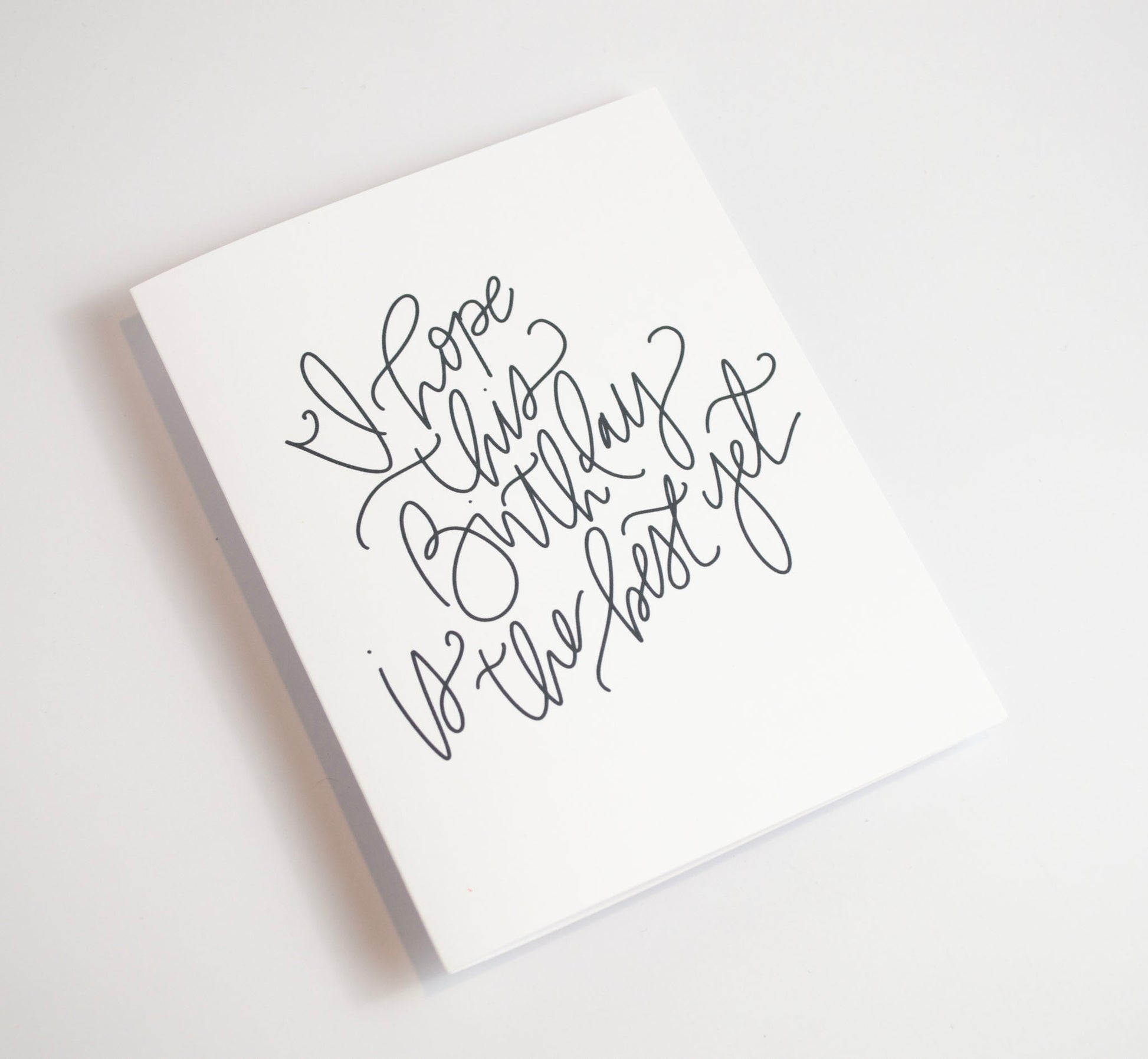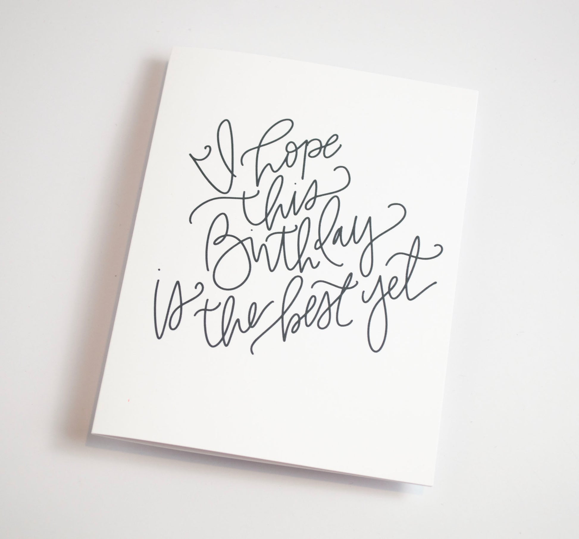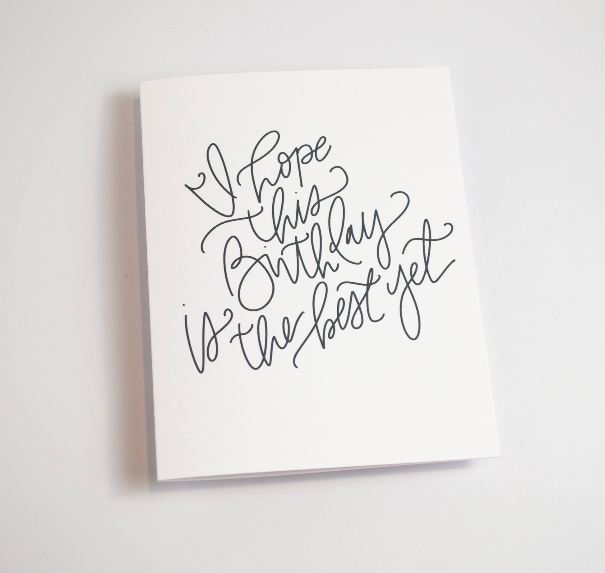 This item is a hand lettered greeting card in my signature woven lettered style. The front of the card simply reads "I hope this is your best birthday yet" in bold, black ink. The inside of the card is blank, white card stock for you to write your own heartfelt message. This card is printed on thick, smooth 110 lb card stock that feels both sturdy and luxurious in your hands.