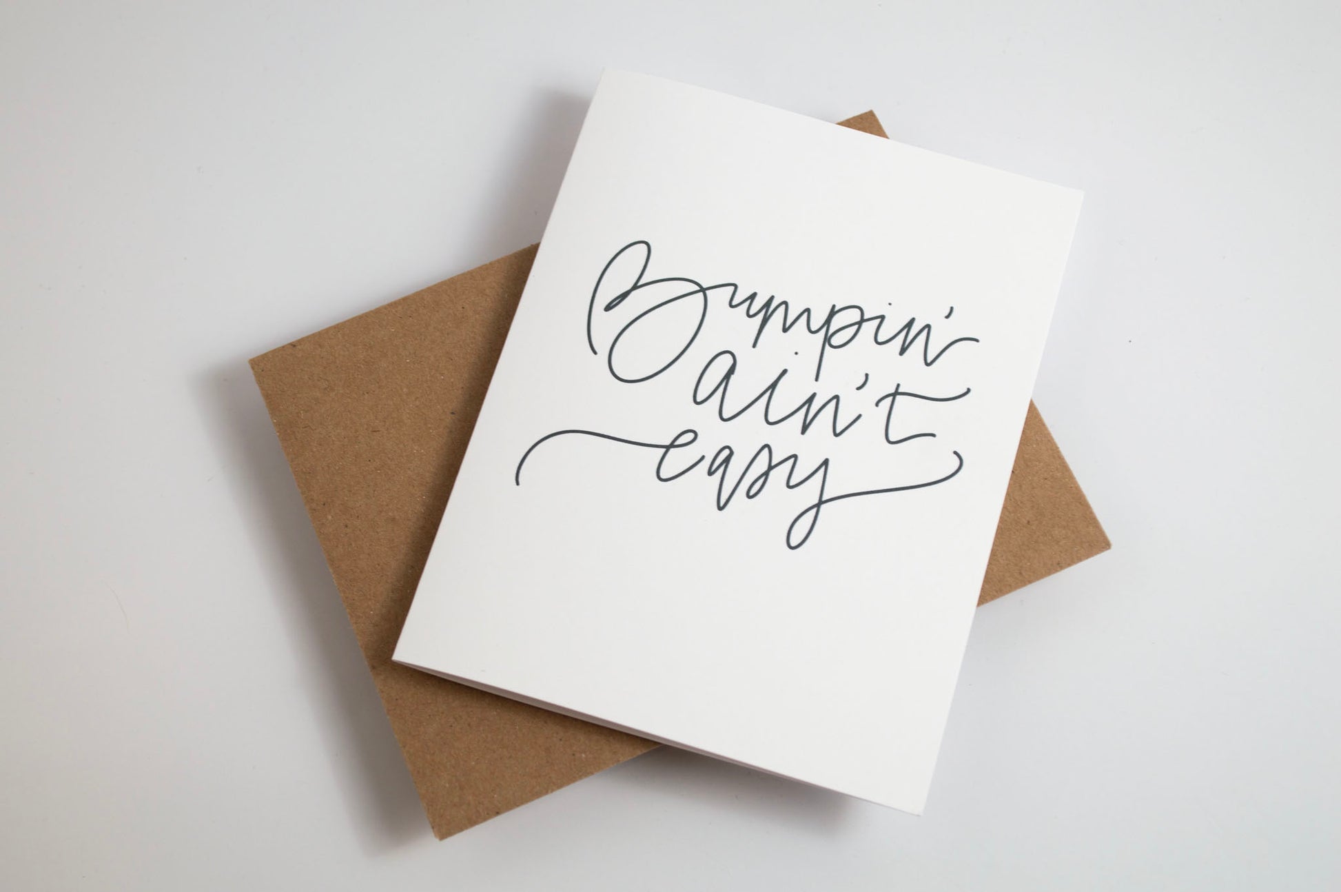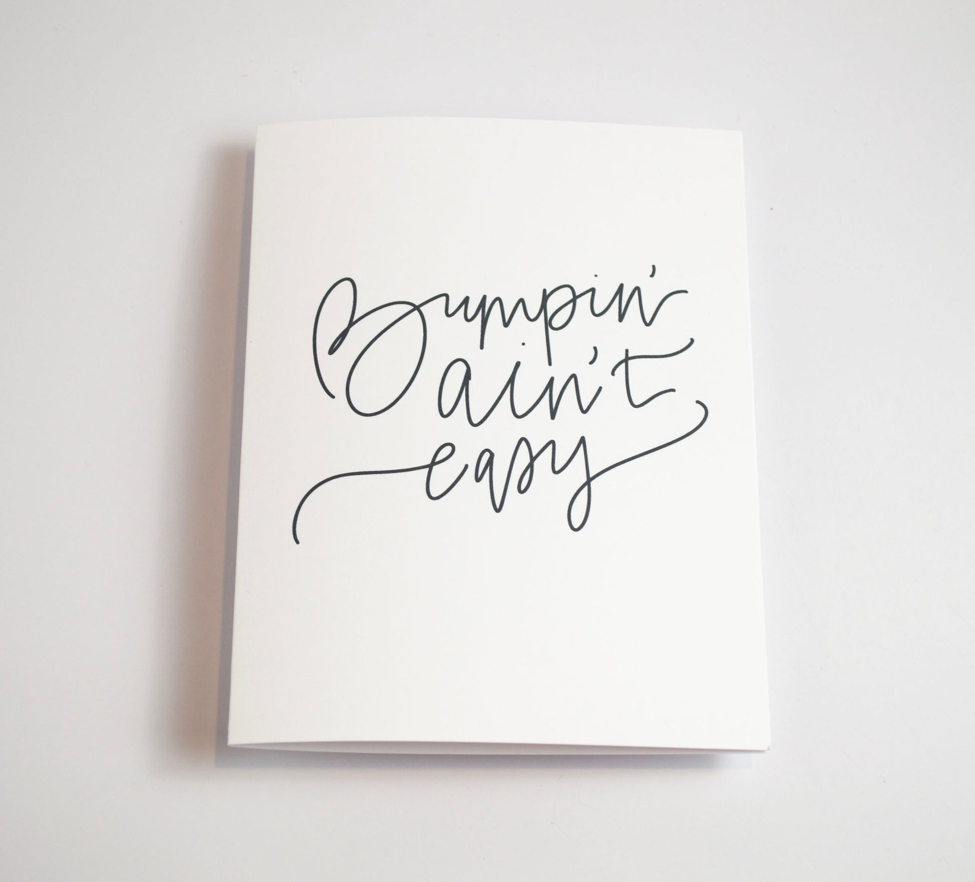 This item is a hand lettered greeting card in my signature woven lettering style. The front of the card reads "bumpin' ain't easy" in bold, black ink atop a white background. The inside of the card is blank for you to write your own message. This card is printed on thick, smooth 110 lb card stock that feels both sturdy and luxurious in your hands.