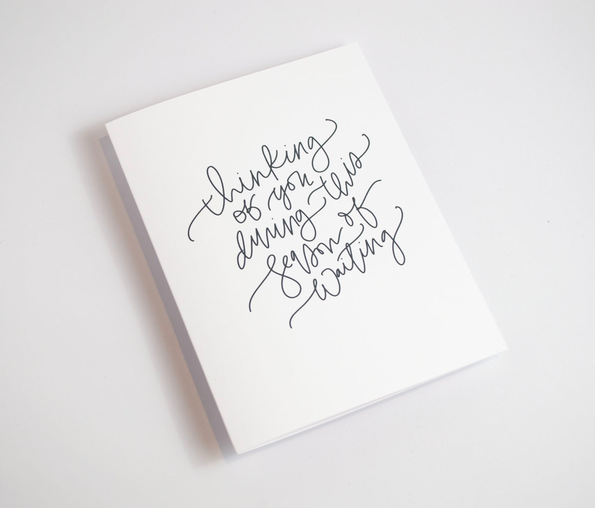 This item is a hand lettered greeting card in my signature woven lettered style. The front of the card reads "thinking of you during this season of waiting" in bold, black ink. The inside of the card is blank for you to write your own message of encouragement. This card is printed on thick, smooth 110 lb card stock that feels both sturdy and luxurious in your hands.