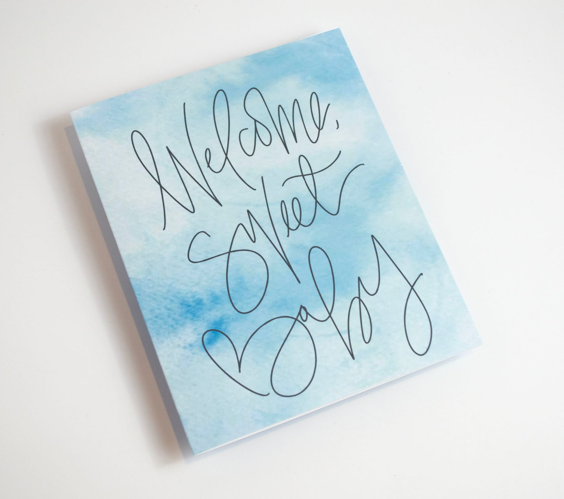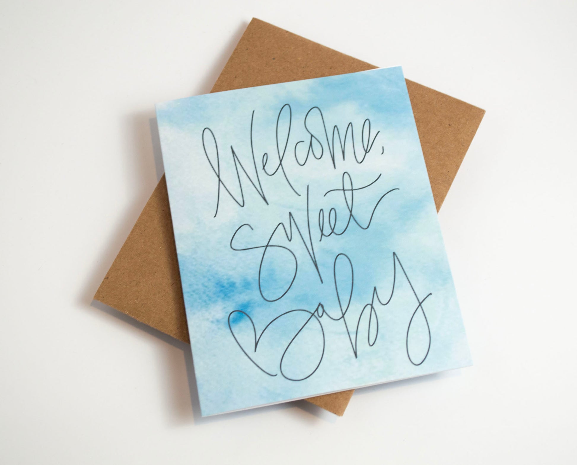 This item is a hand lettered greeting card in my signature woven lettered style. The front of the card reads "Welcome, Sweet Baby" in bold, black ink atop a soft blue watercolor background. The inside of the card is blank for you to write your own message to the new parents. This card is printed on thick, smooth 110 lb card stock that feels both sturdy and luxurious in your hands.