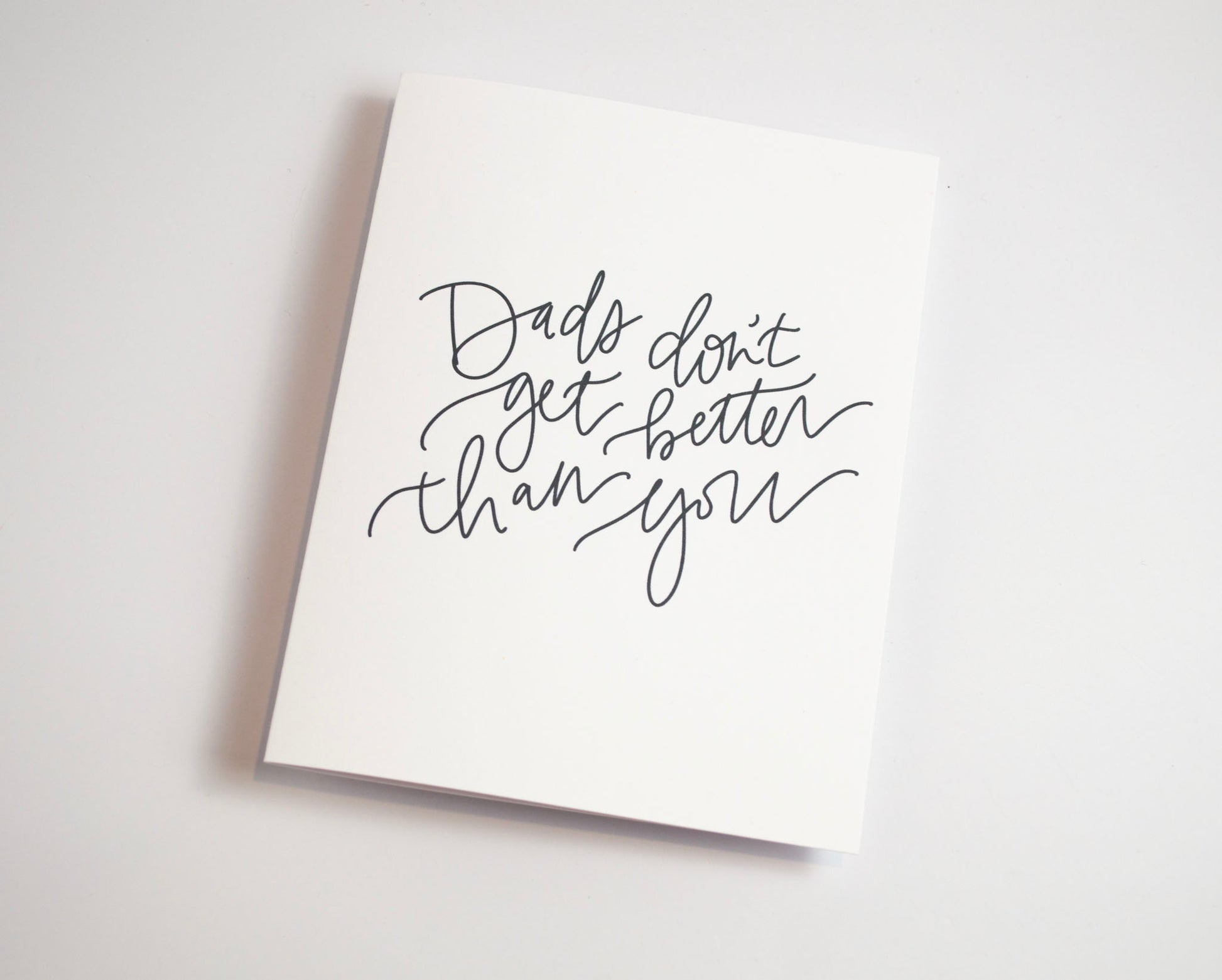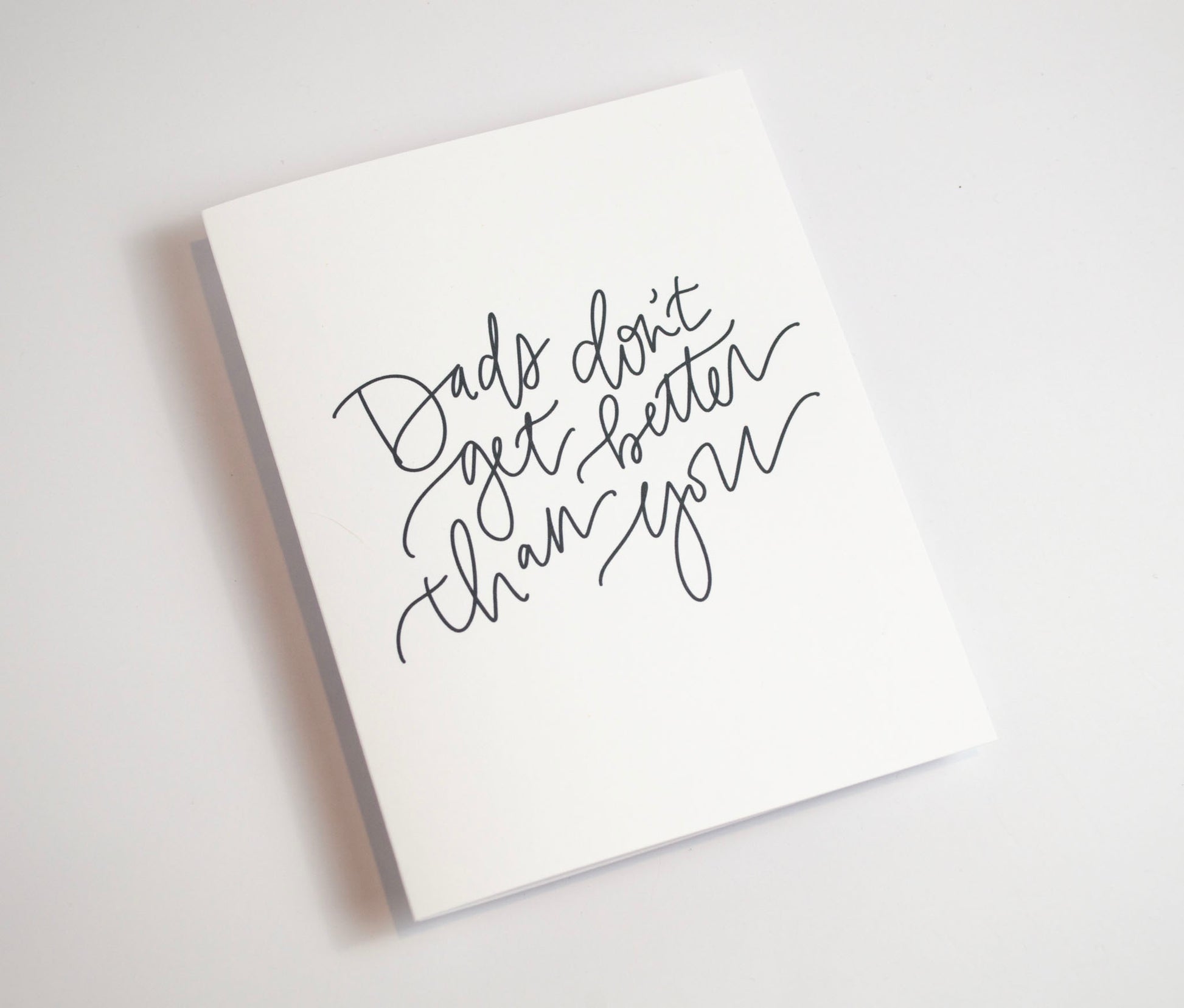 This item is a hand lettered greeting card in my signature woven lettering style. The front of the card reads "dads don't get better than you" in bold, black ink atop a white background. The inside of the card is blank for you to write your own message. This card is printed on thick, smooth 110 lb card stock that feels both sturdy and luxurious in your hands.