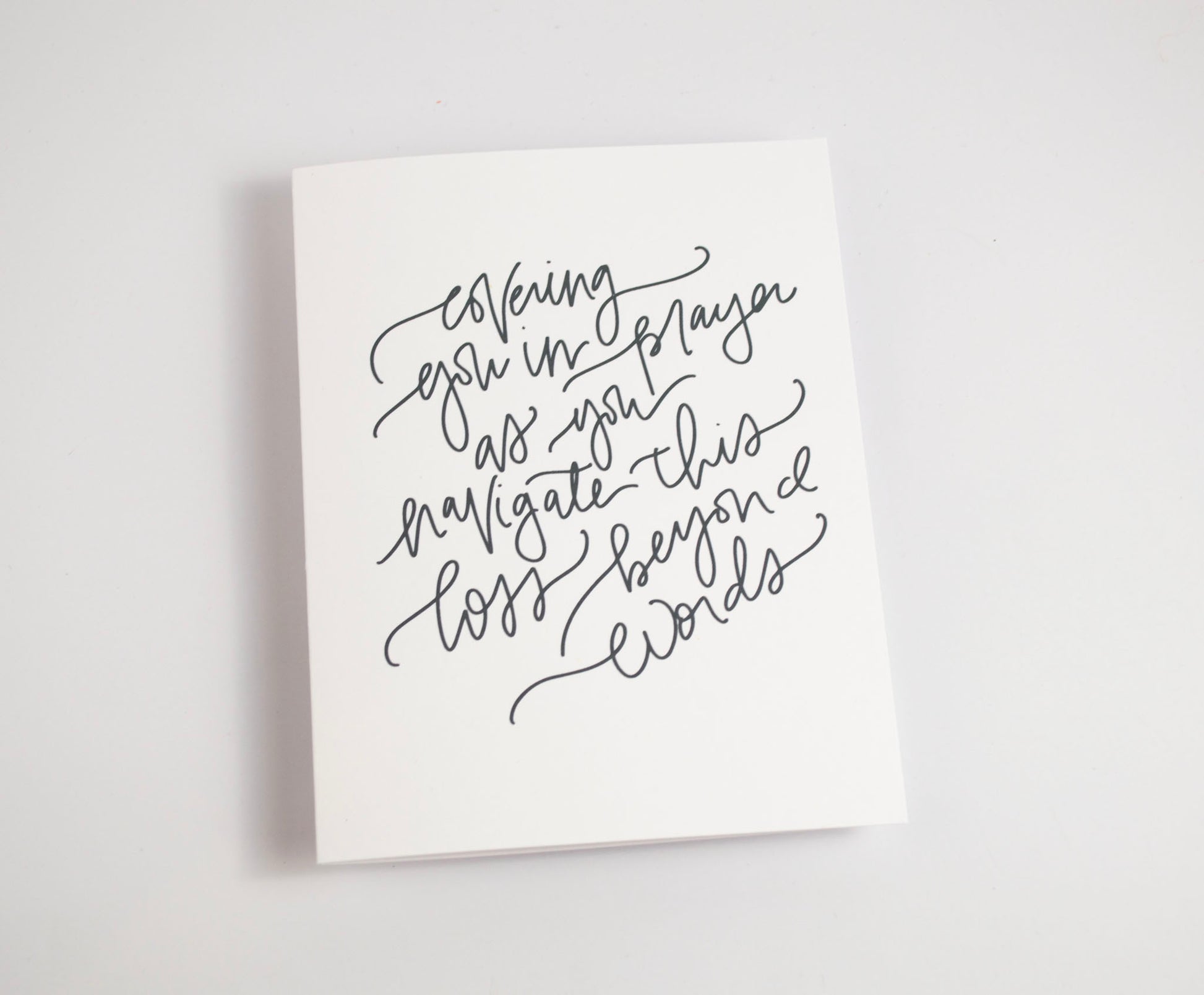 This item is a hand lettered greeting card in my signature woven lettered style. The front of the card reads "covering you in prayer as you navigate this loss beyond words" in bold, black ink. The inside of the card is blank for you to write your own heartfelt message. This card is printed on thick, smooth 110 lb card stock that feels both sturdy and luxurious in your hands.