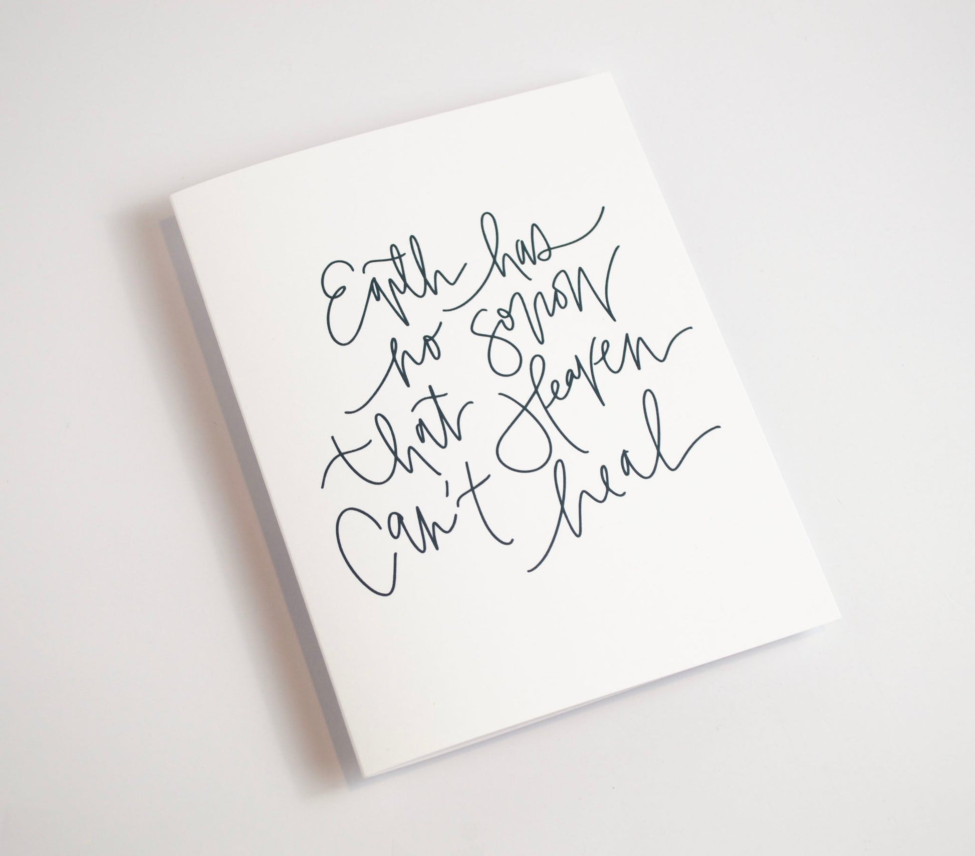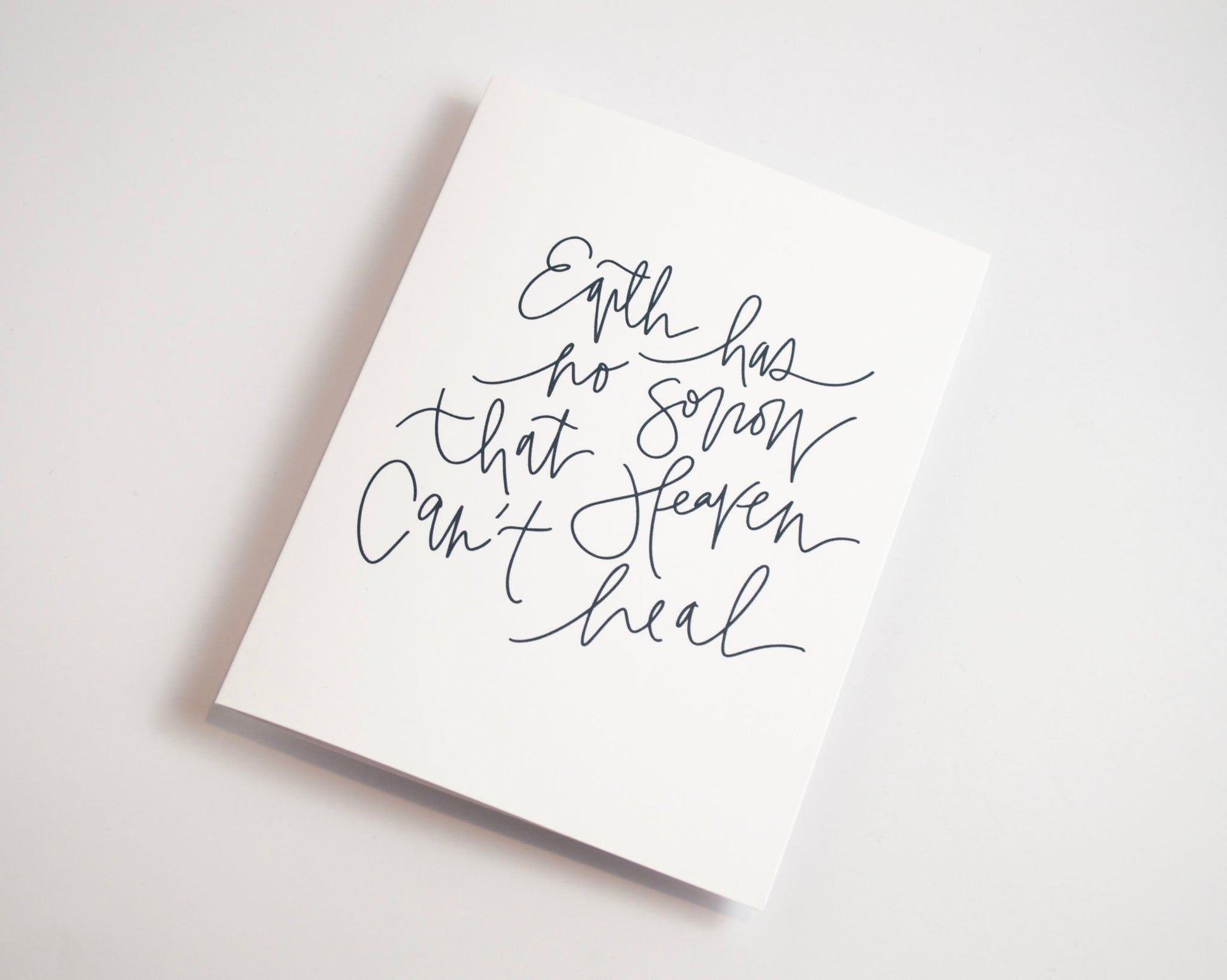 This item is a hand lettered greeting card in my signature woven lettered style. The front of the card reads "Heaven Has No Sorrow That Heaven Can't Heal" in bold, black ink atop a white background. The inside of the card is blank for you to write your own heartfelt message. This card is printed on thick, smooth 110 lb card stock that feels both sturdy and luxurious in your hands.