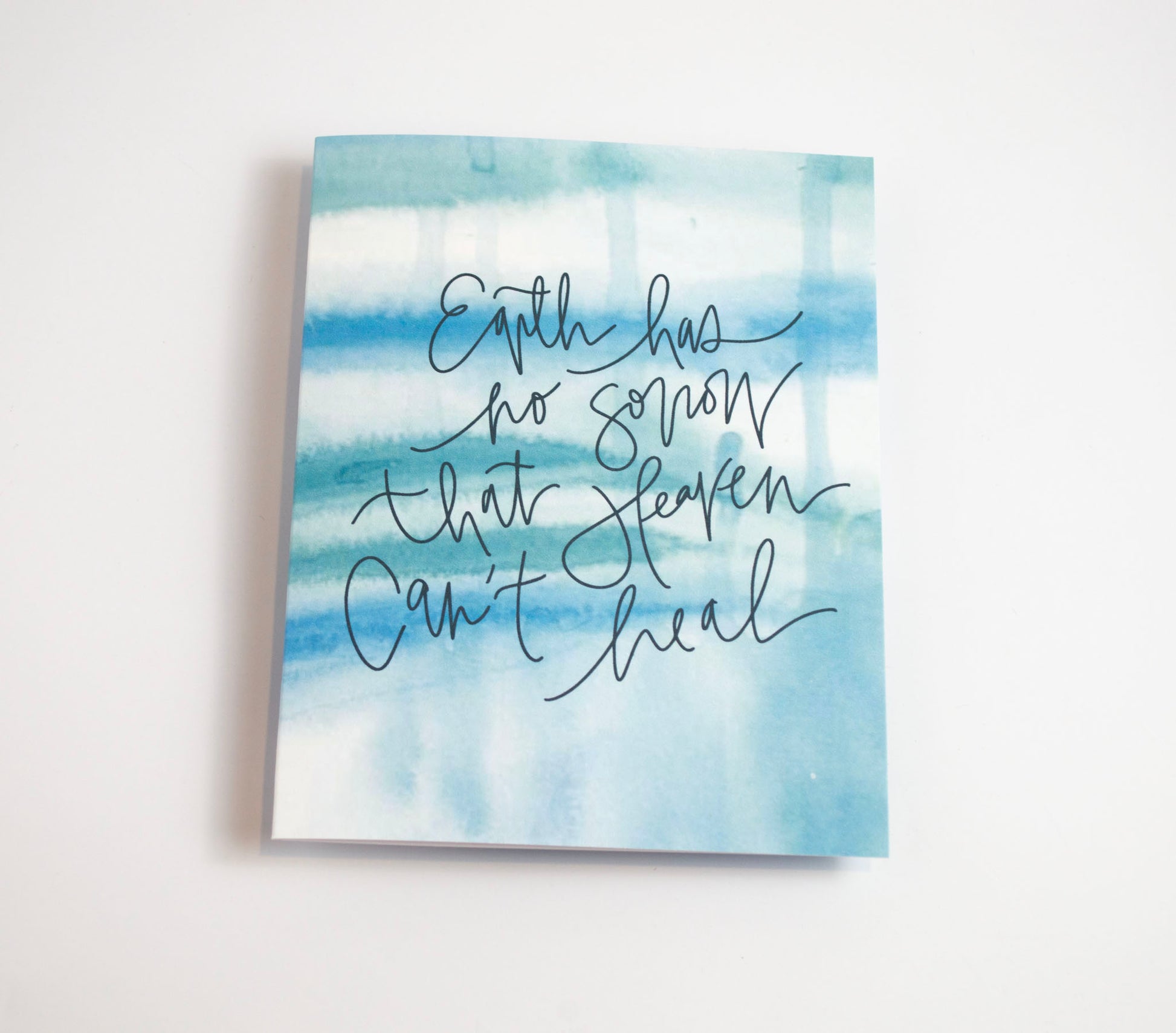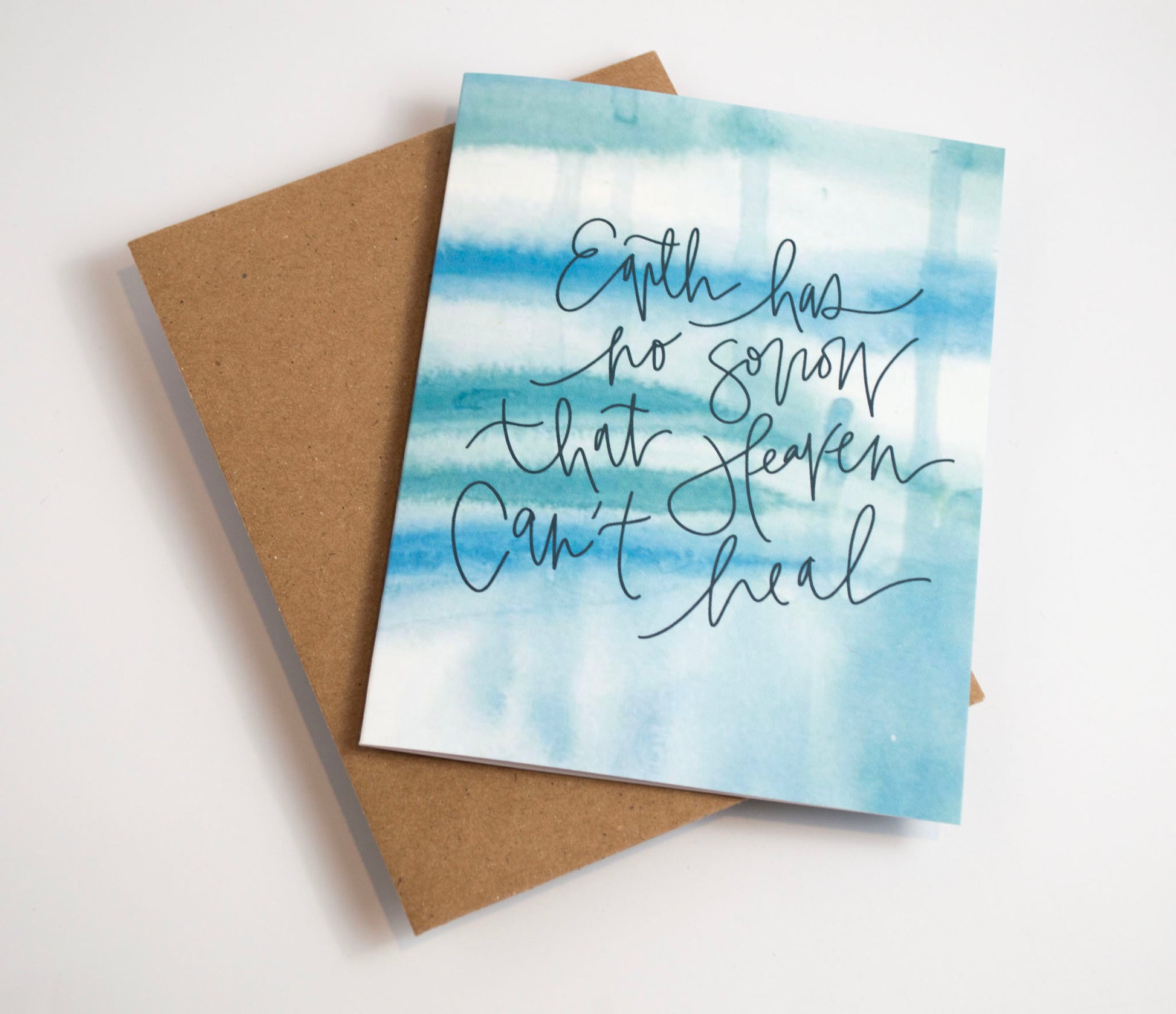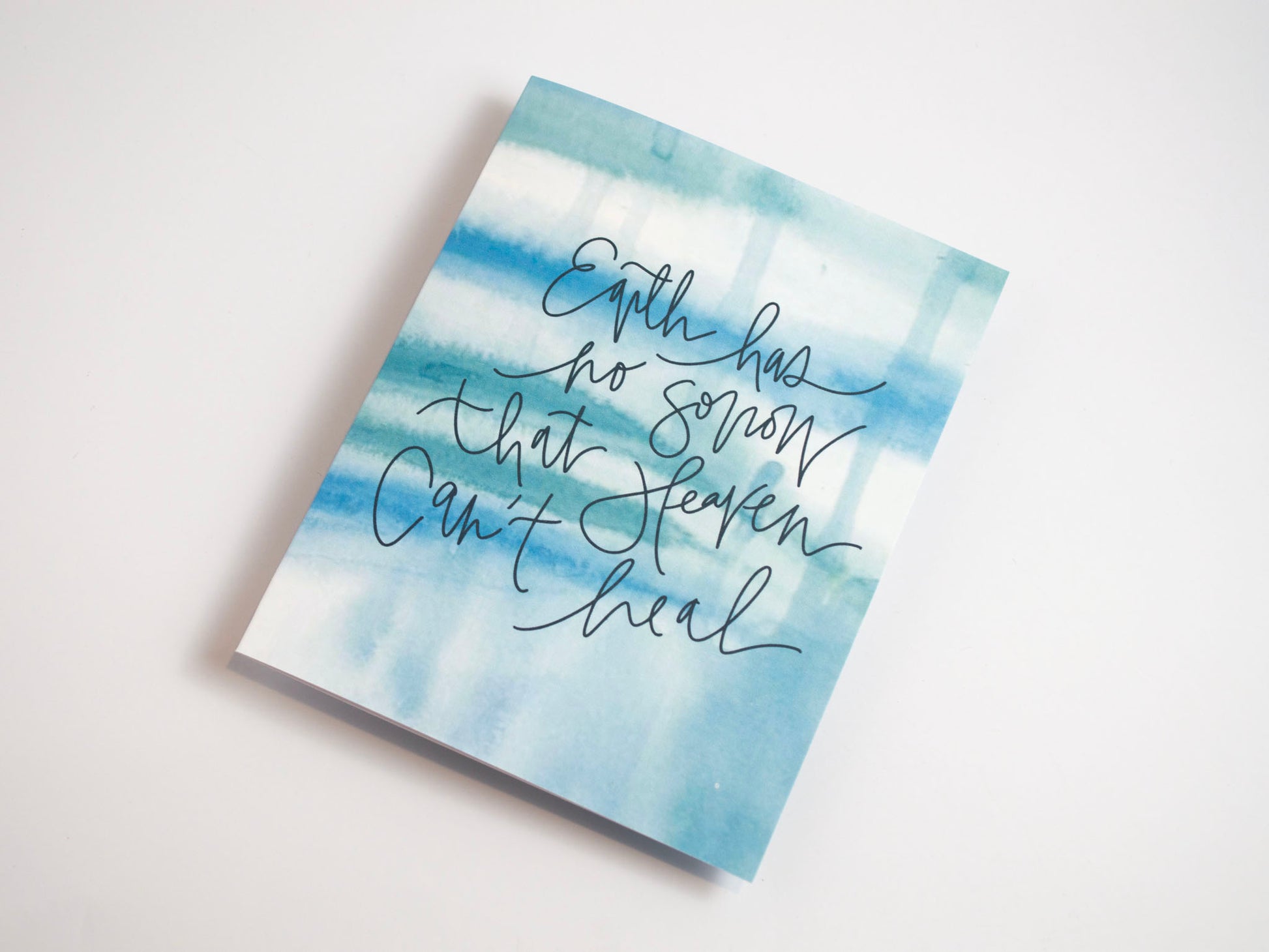 This item is a hand lettered greeting card in my signature woven lettered style. The front of the card reads "Heaven Has No Sorrow That Heaven Can't Heal" in bold, black ink atop a deep blue watercolor background. The inside of the card is blank for you to write your own heartfelt message. This card is printed on thick, smooth 110 lb card stock that feels both sturdy and luxurious in your hands.