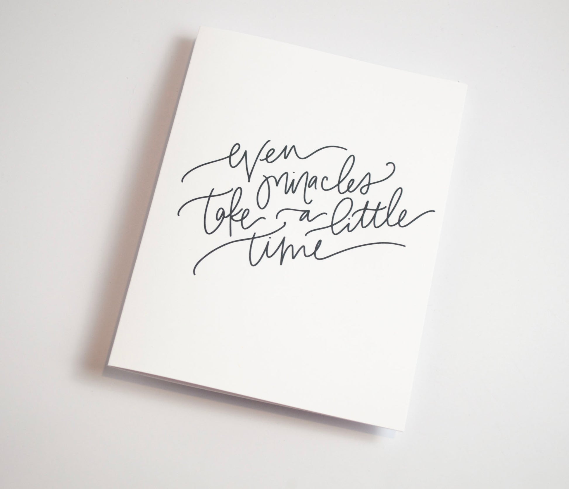 This item is a hand lettered greeting card in my signature woven lettering style. The front of the card reads "even miracles take a little time" in bold, black ink atop a white background. The inside of the card is blank for you to write your own message. This card is printed on thick, smooth 110 lb card stock that feels both sturdy and luxurious in your hands.
