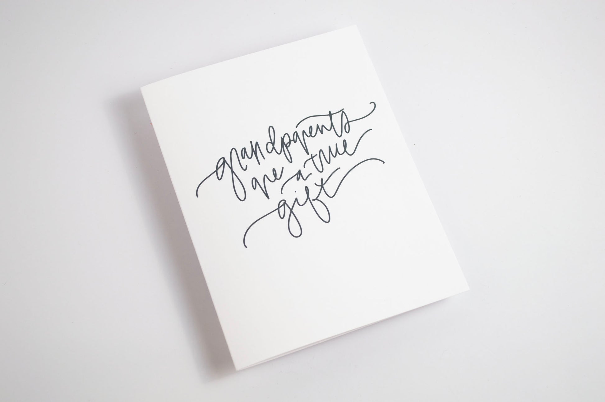 This item is a hand lettered greeting card in my signature woven lettering style. The front of the card reads "grandparents are a true gift" in bold, black ink atop a white background. The inside of the card is blank for you to write your own message. This card is printed on thick, smooth 110 lb card stock that feels both sturdy and luxurious in your hands.