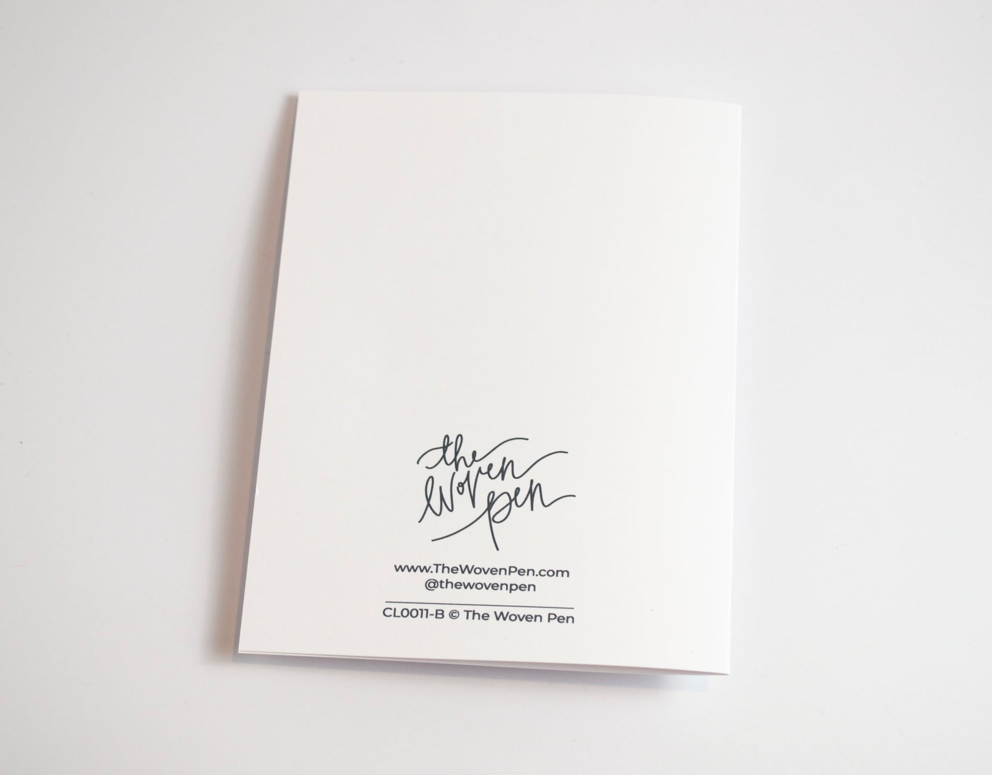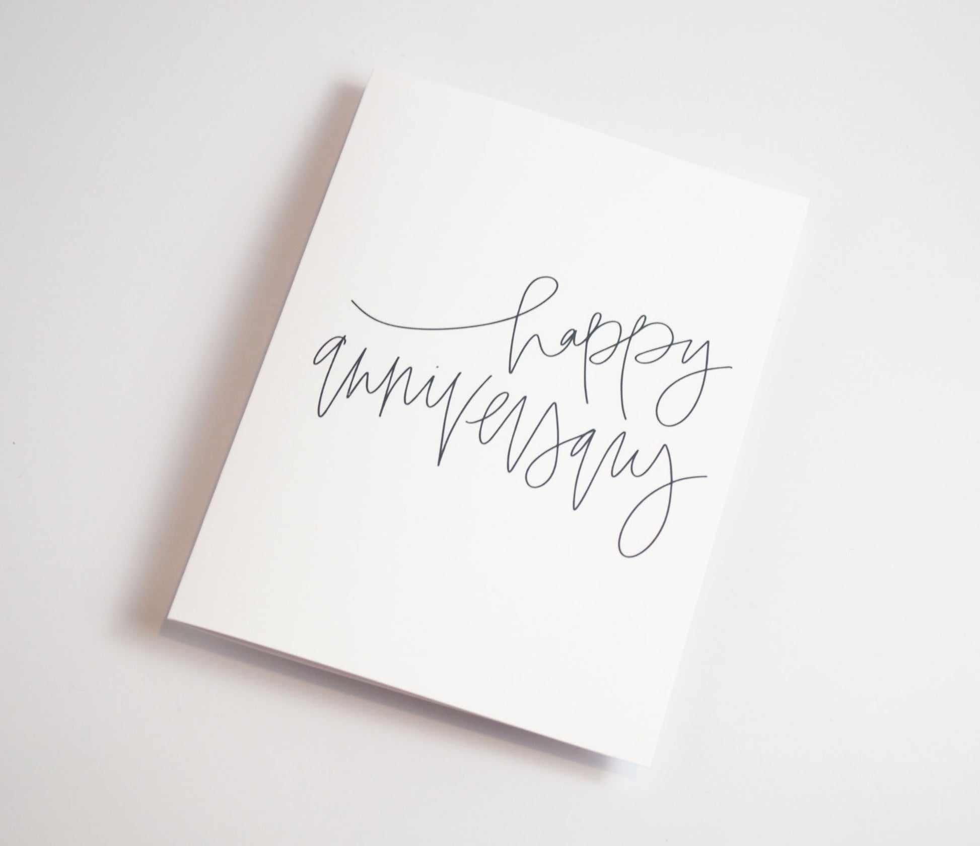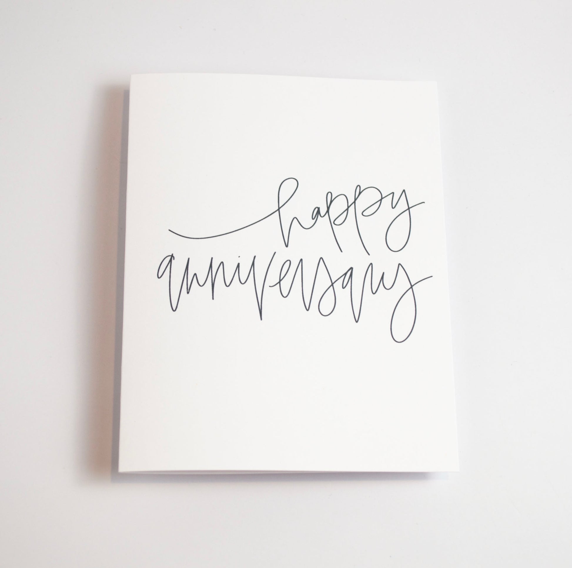 This item is a hand lettered greeting card in my signature woven lettered style. The front of the card simply reads "happy anniversary" in bold, black ink. The inside of the card is blank for you to write your own message to your love. This card is printed on thick, smooth 110 lb card stock that feels both sturdy and luxurious in your hands.