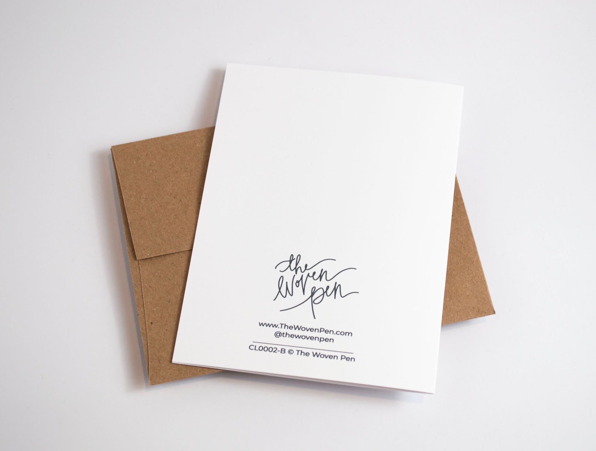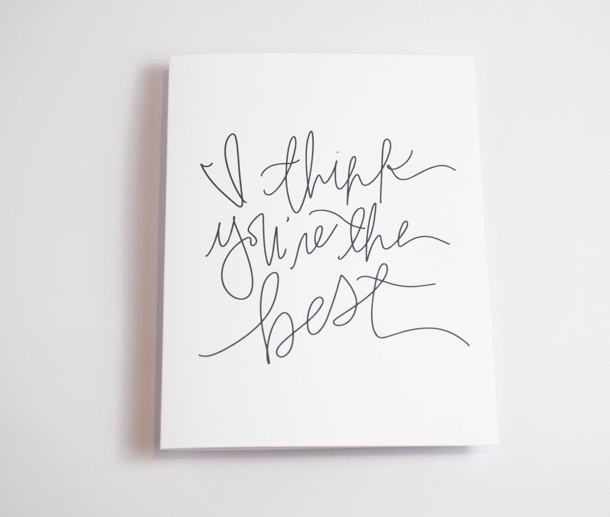 This item is a hand lettered greeting card in my signature woven lettered style. The front of the card simply reads "I Think You're Just the Best" in bold, black ink. The inside of the card is blank for you to write your own message to the lucky recipient. This card is printed on thick, smooth 110 lb card stock that feels both sturdy and luxurious in your hands.