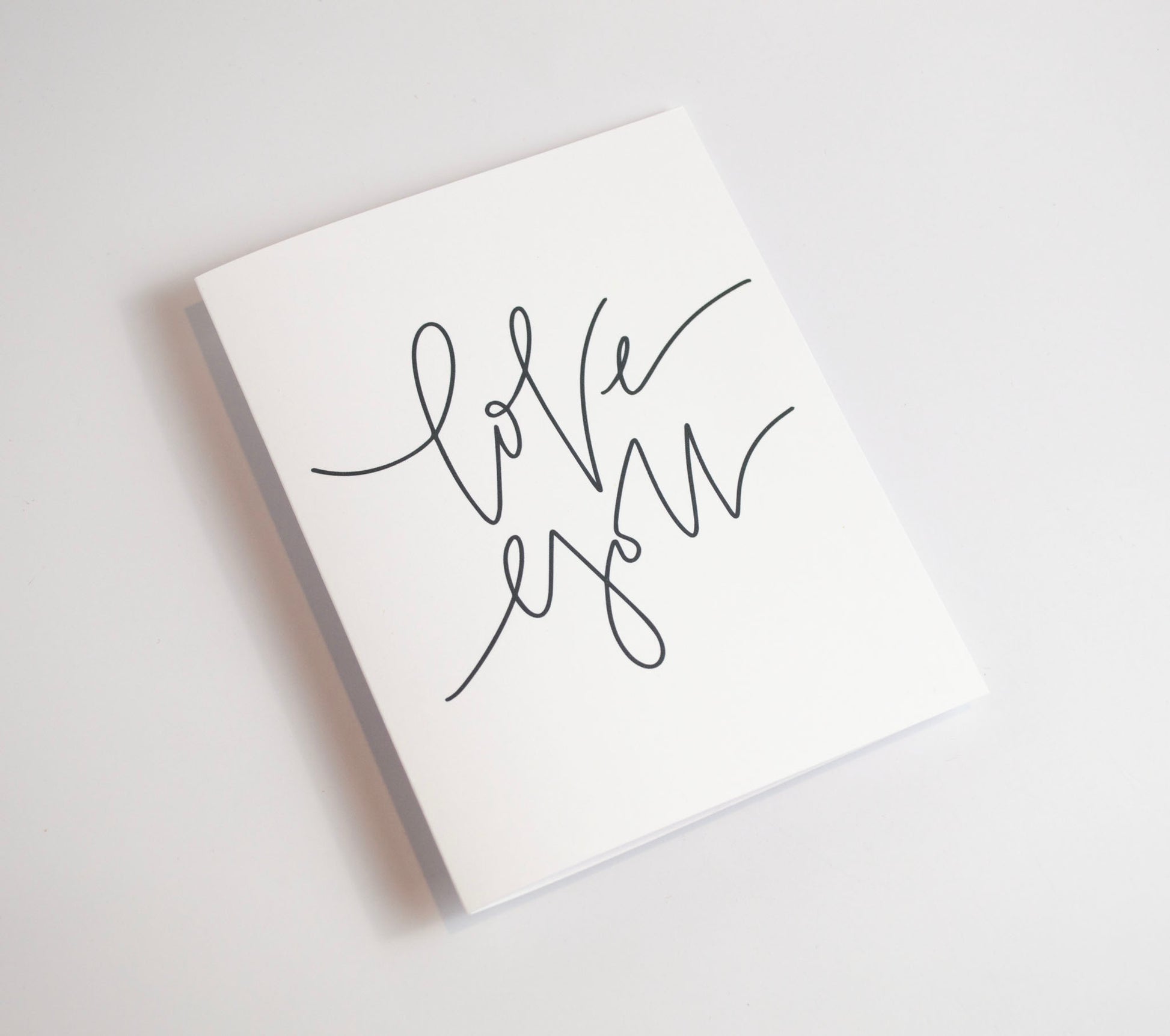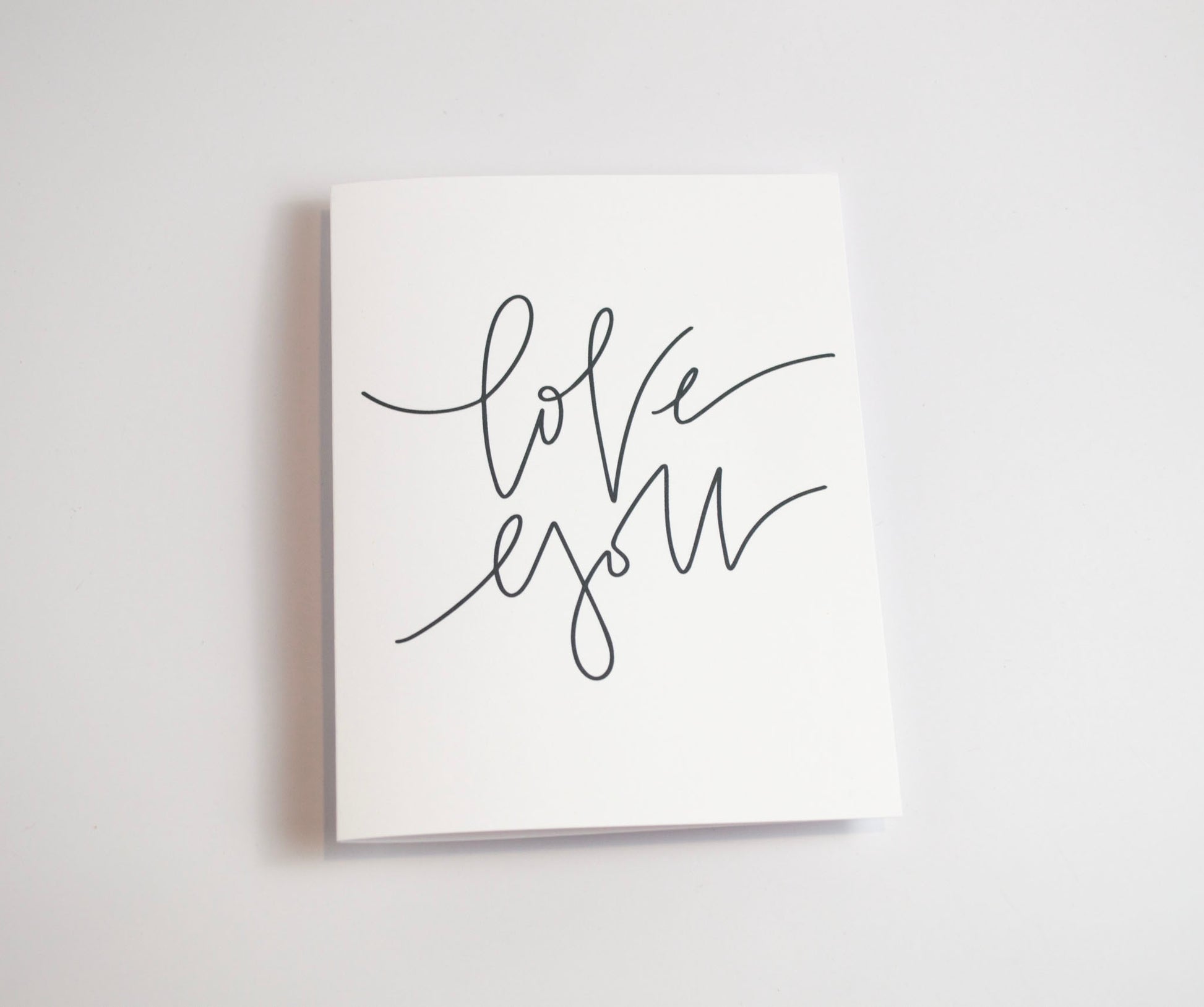 This item is a hand lettered greeting card in my signature woven lettered style. The front of the card simply reads "Love You" in bold, black ink. The inside of the card is blank for you to write your own message to your love. This card is printed on thick, smooth 110 lb card stock that feels both sturdy and luxurious in your hands.