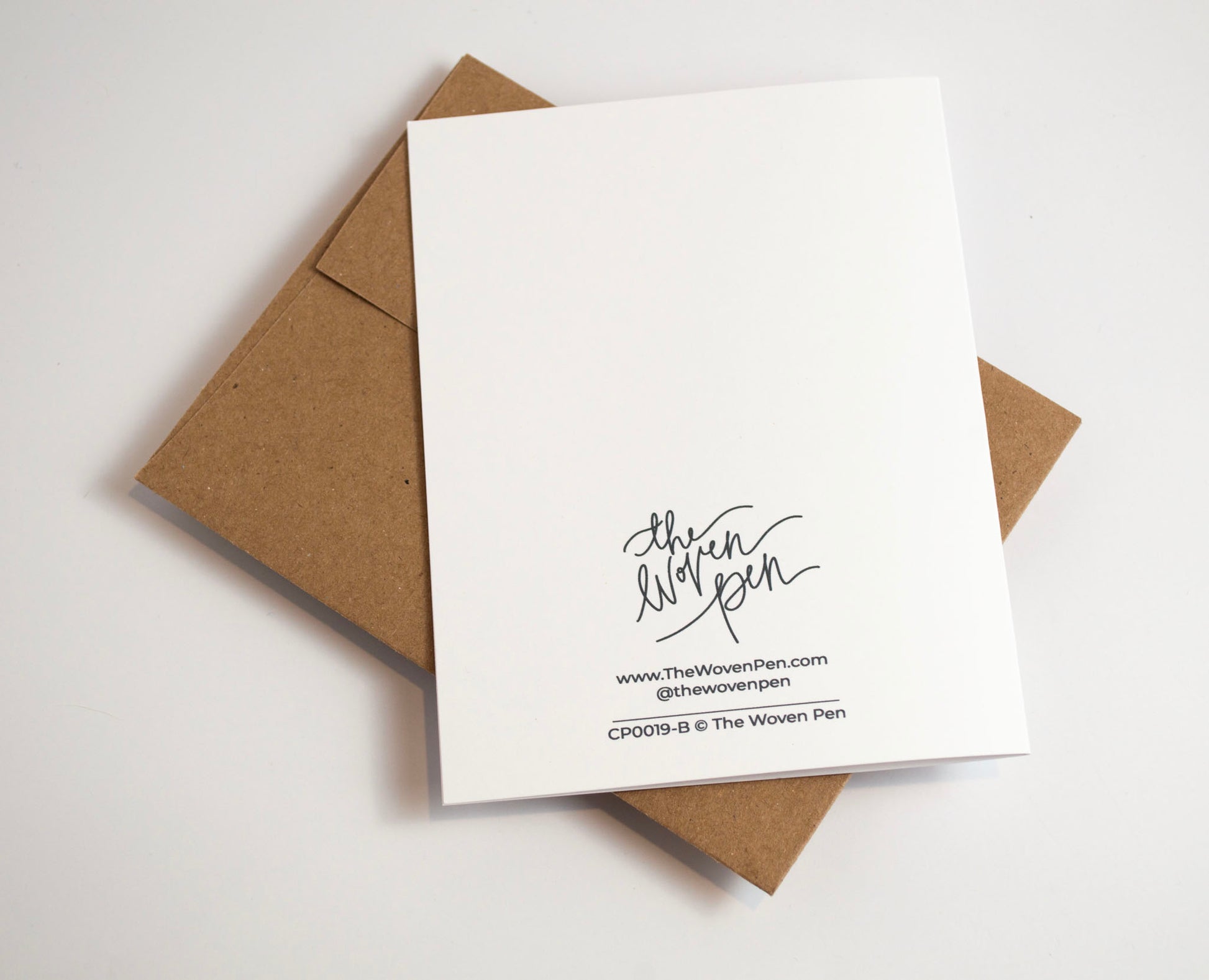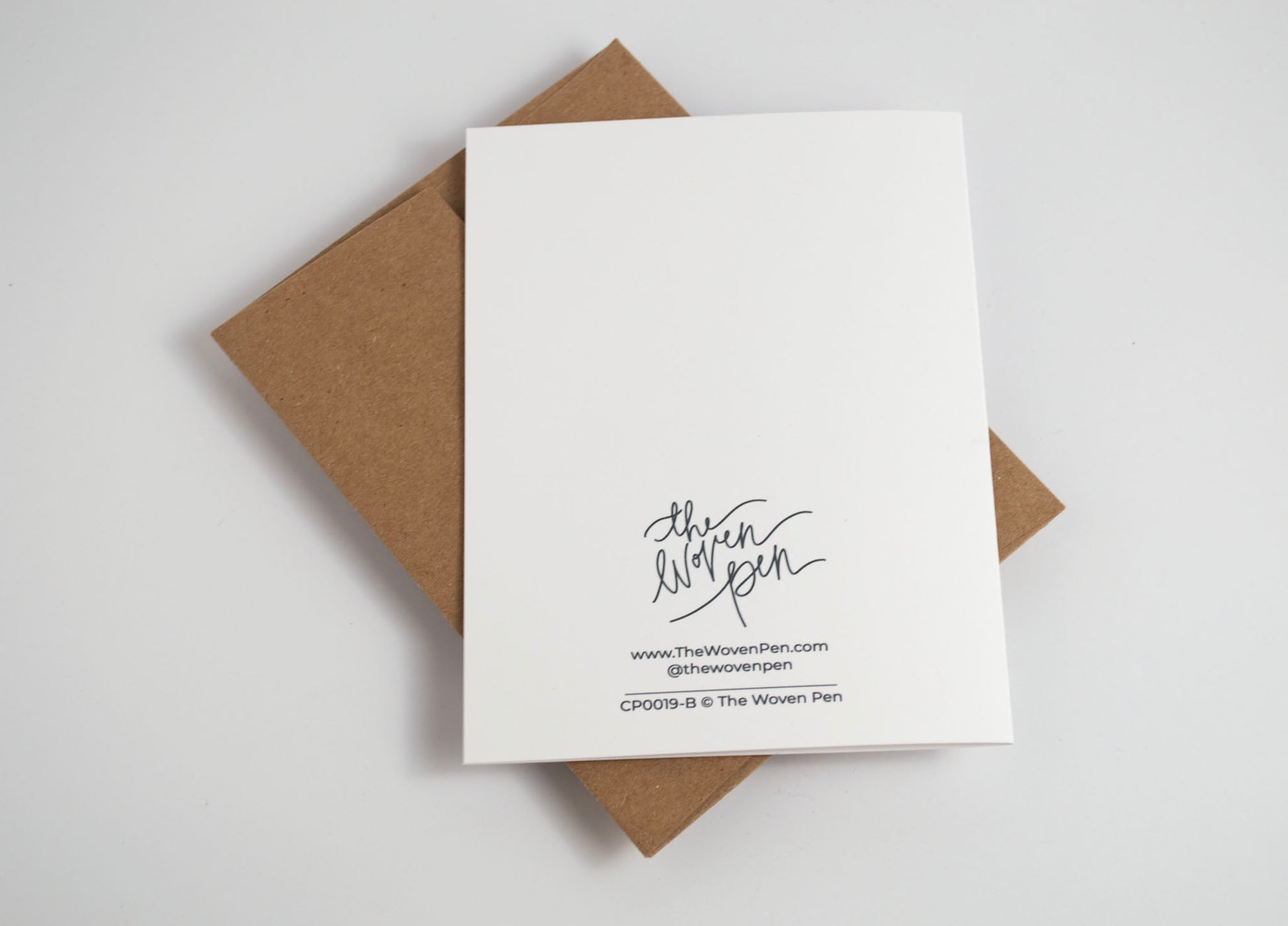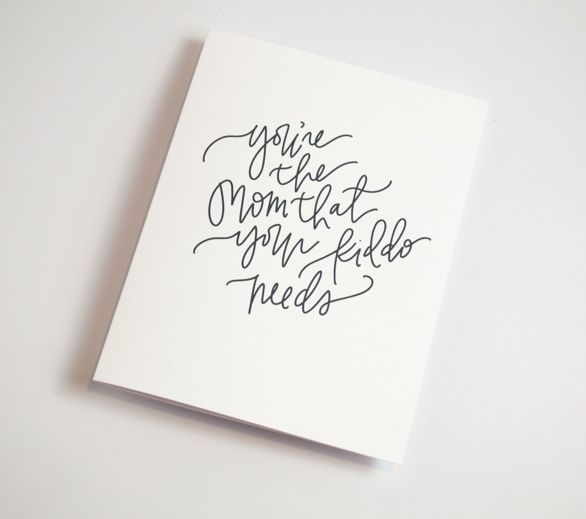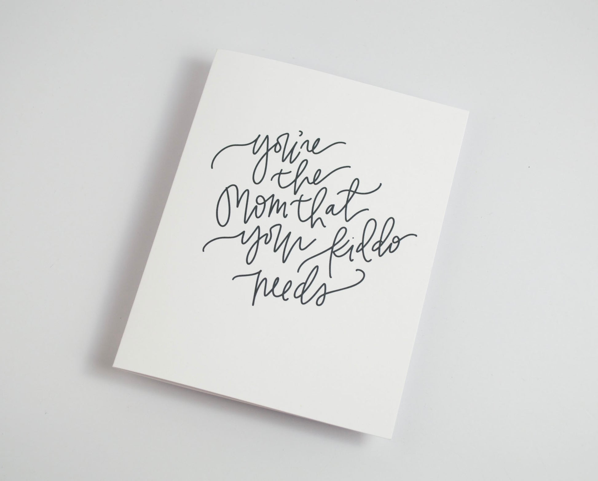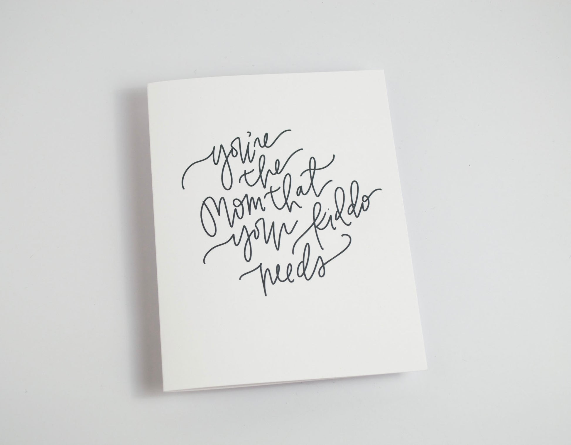 This item is a hand lettered greeting card in my signature woven lettered style. The front of the card reads "you're tge mom your kiddo needs" in bold, black ink atop a white background. The inside of the card is blank for you to write your own message. This card is printed on thick, smooth 110 lb card stock that feels both sturdy and luxurious in your hands.