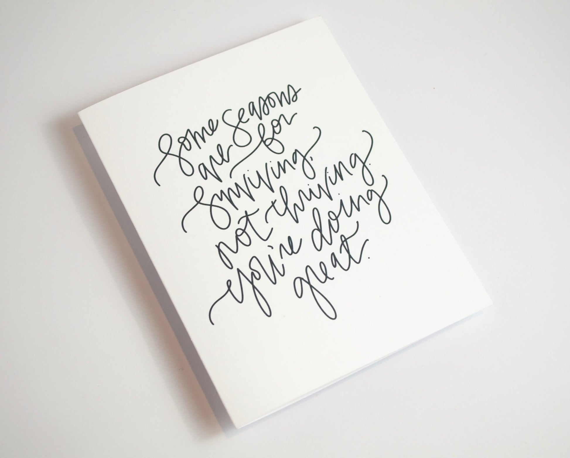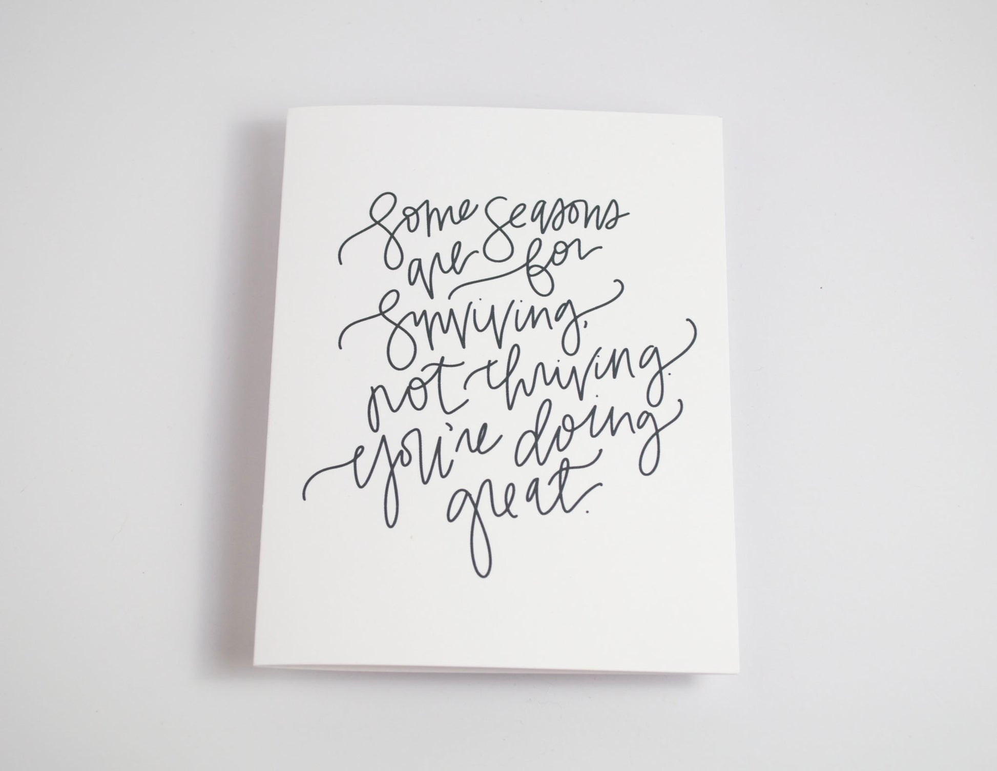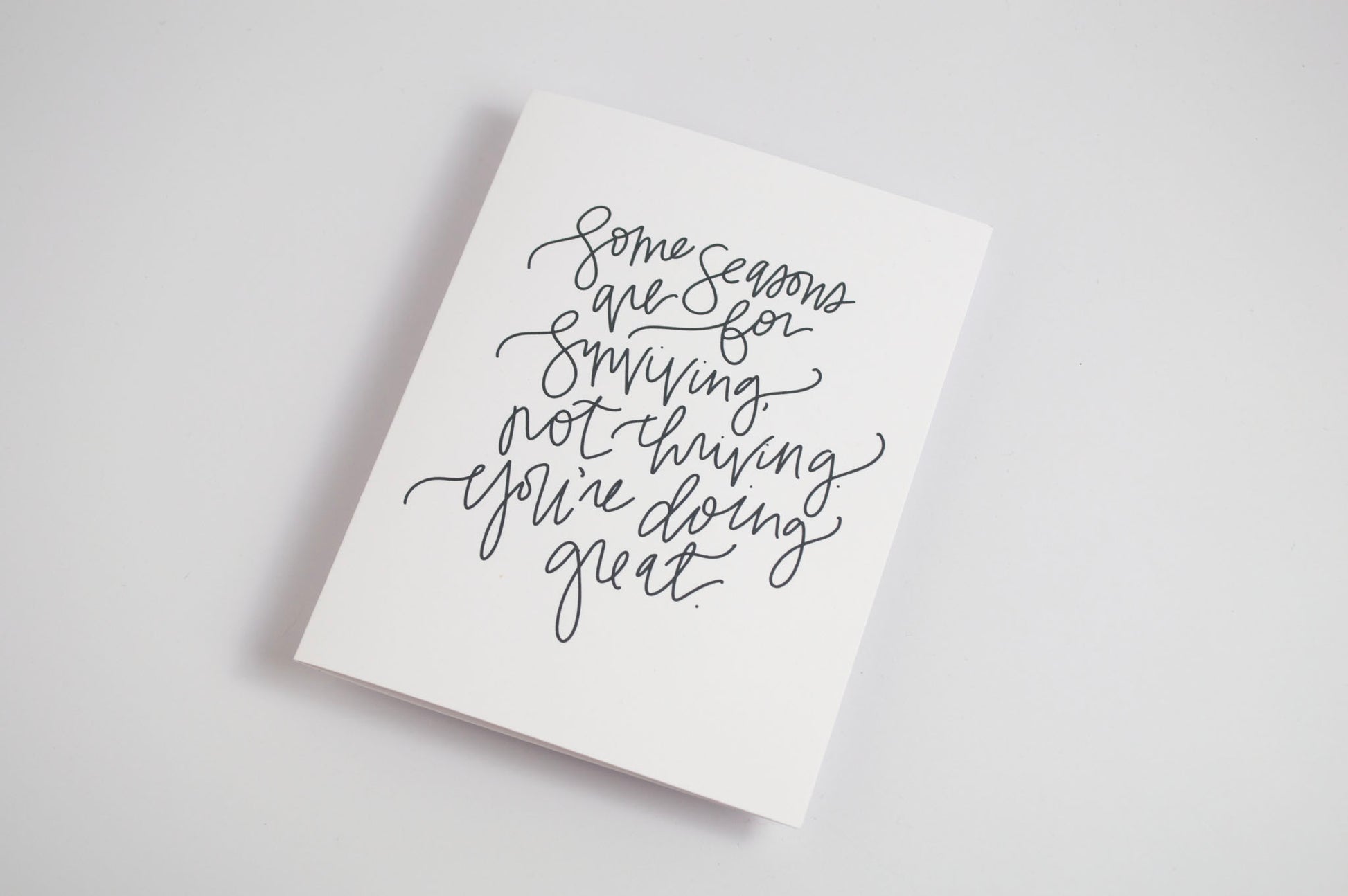This item is a hand lettered greeting card in my signature woven lettered style. The front of the card reads "Some seasons are for surviving not thriving. You're doing great." in bold, black ink. The inside of the card is blank for you to write your own message of encouragement. This card is printed on thick, smooth 110 lb card stock that feels both sturdy and luxurious in your hands.