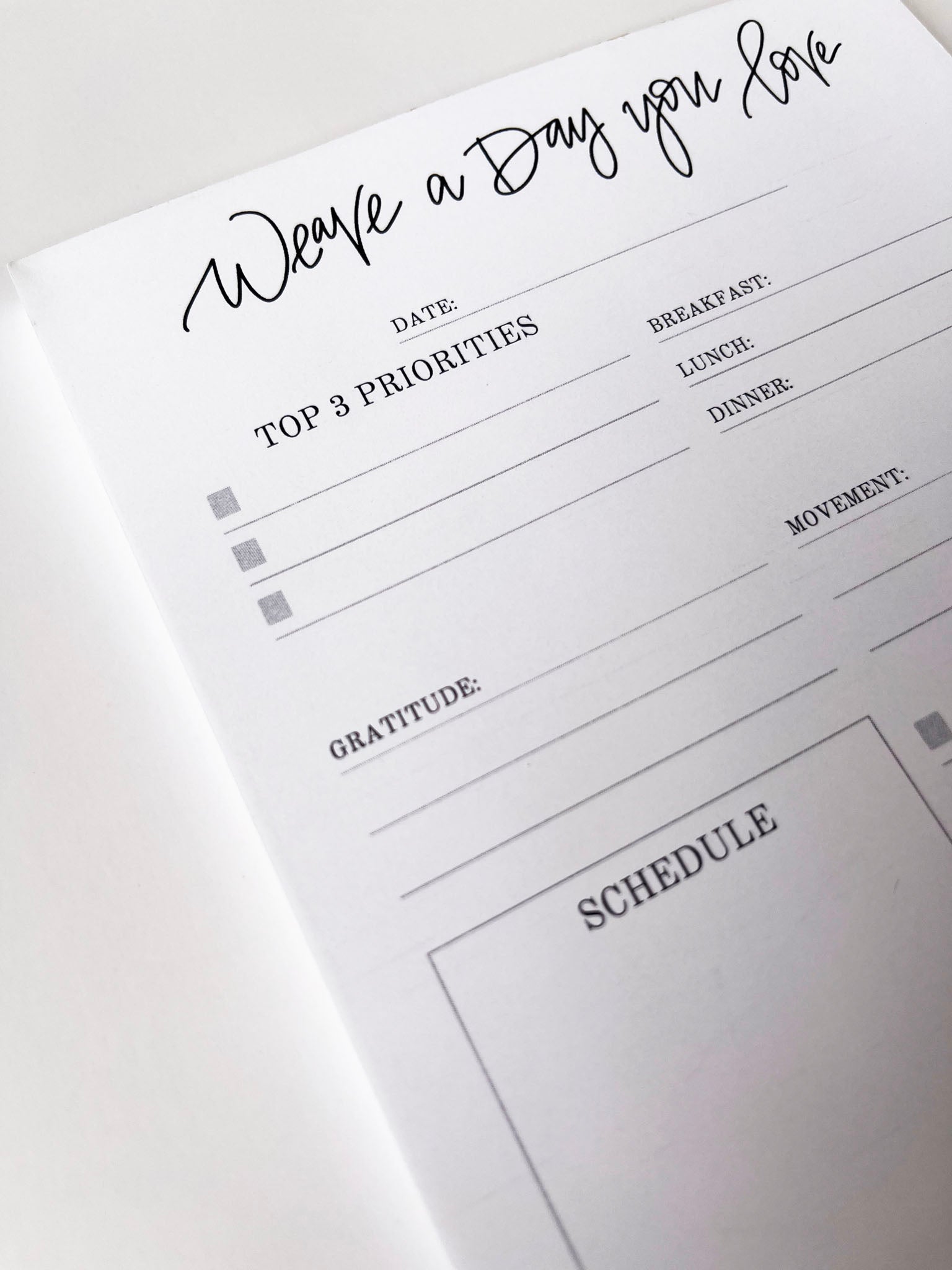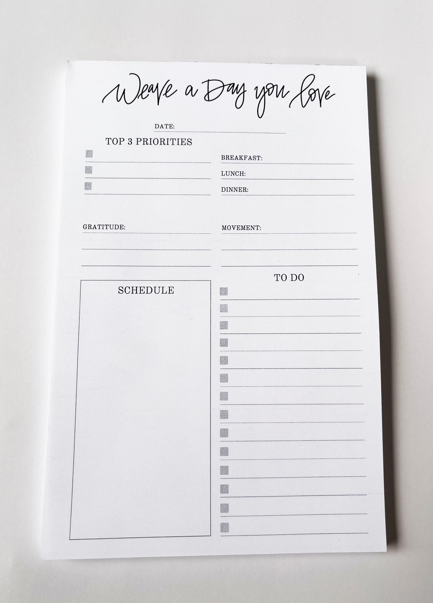 Unleash the power of thoughtful planning with the "Weave a Day You Love Notepad." Crafted for the busy mom who wants to turn daily to-dos into moments of purpose, this isn’t just a place to jot down tasks—it’s a tool for creating the day you truly want. Whether you’re managing a bustling household, balancing work and family, or finding a moment for yourself, this notepad helps you focus on what really matters.