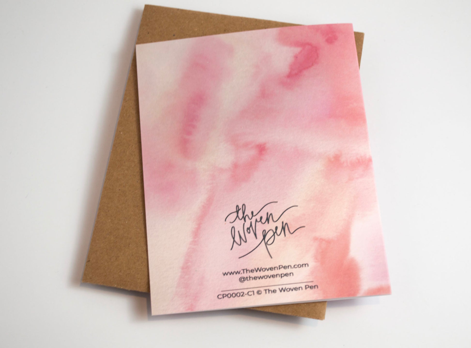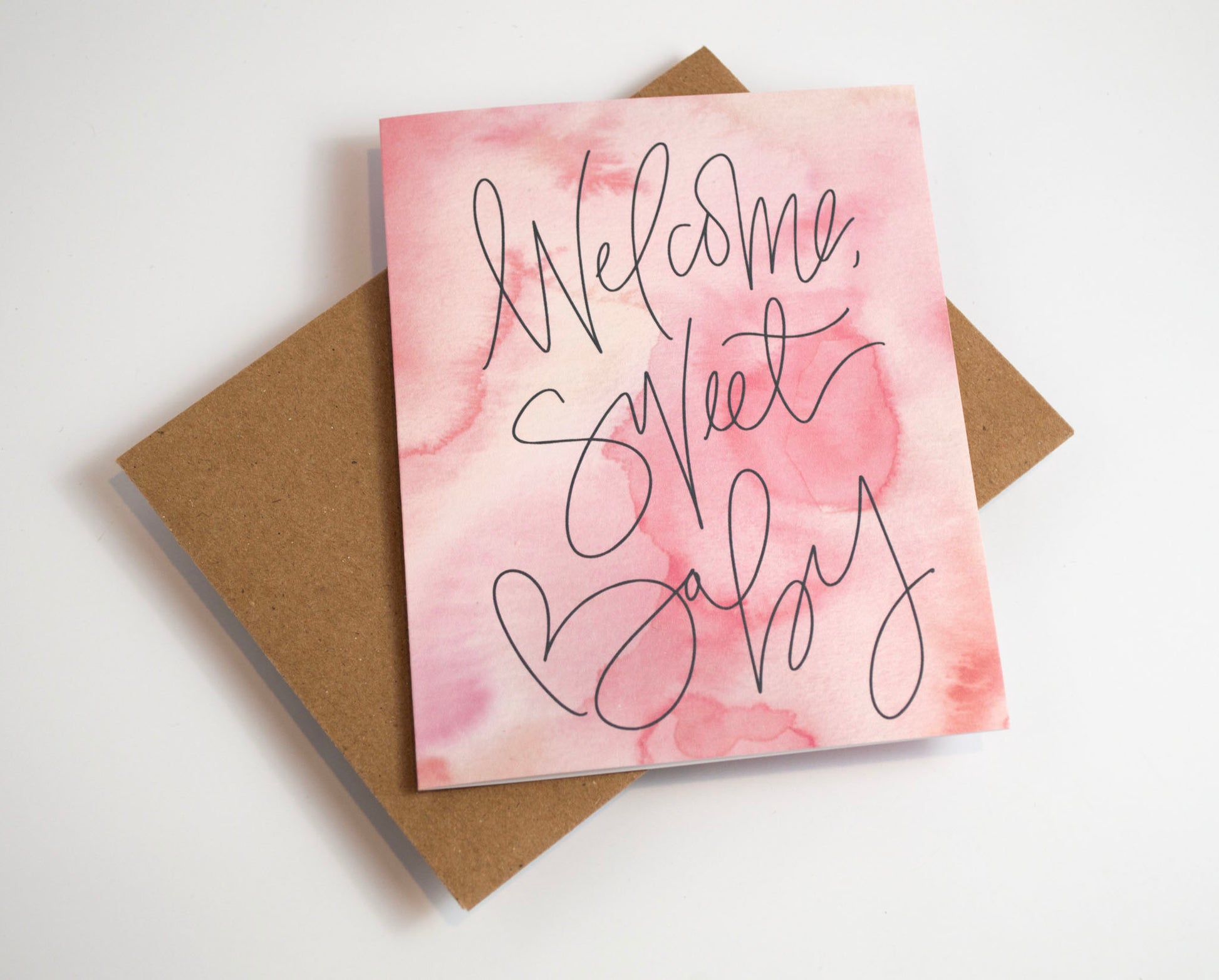 This item is a hand lettered greeting card in my signature woven lettered style. The front of the card reads "Welcome, Sweet Baby" in bold, black ink atop a soft pink watercolor background. The inside of the card is blank for you to write your own message to the new parents. This card is printed on thick, smooth 110 lb card stock that feels both sturdy and luxurious in your hands.