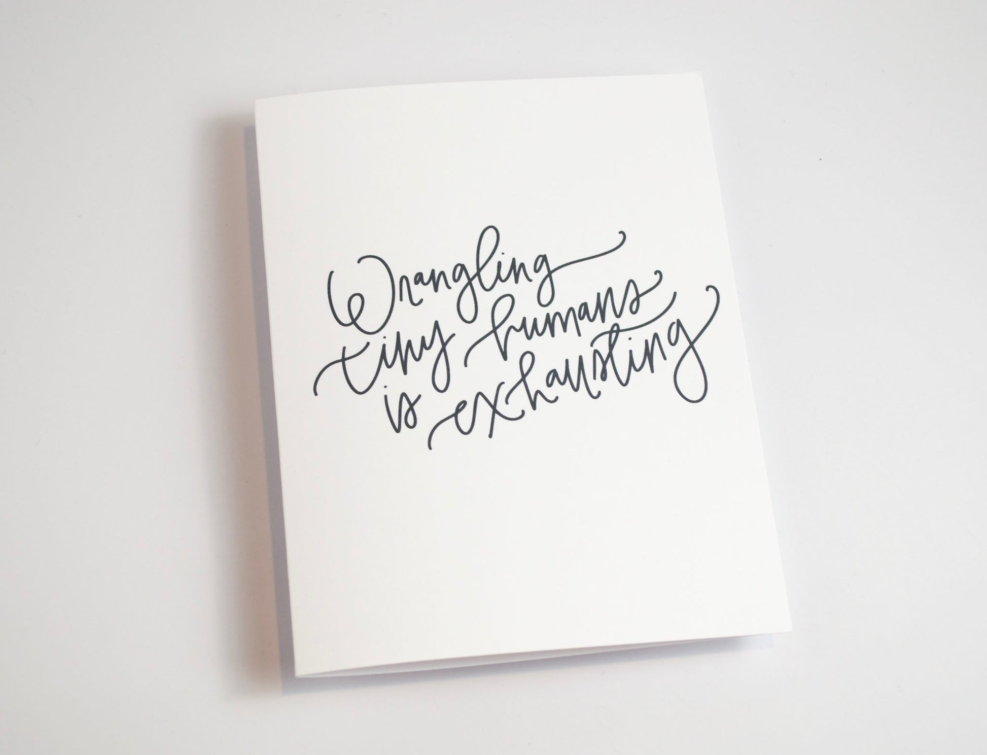 This item is a hand lettered greeting card in my signature woven lettered style. The front of the card reads "wrangling tiny humans is exhausting" in bold, black ink atop a white background. The inside of the card is blank for you to write your own message. This card is printed on thick, smooth 110 lb card stock that feels both sturdy and luxurious in your hands.