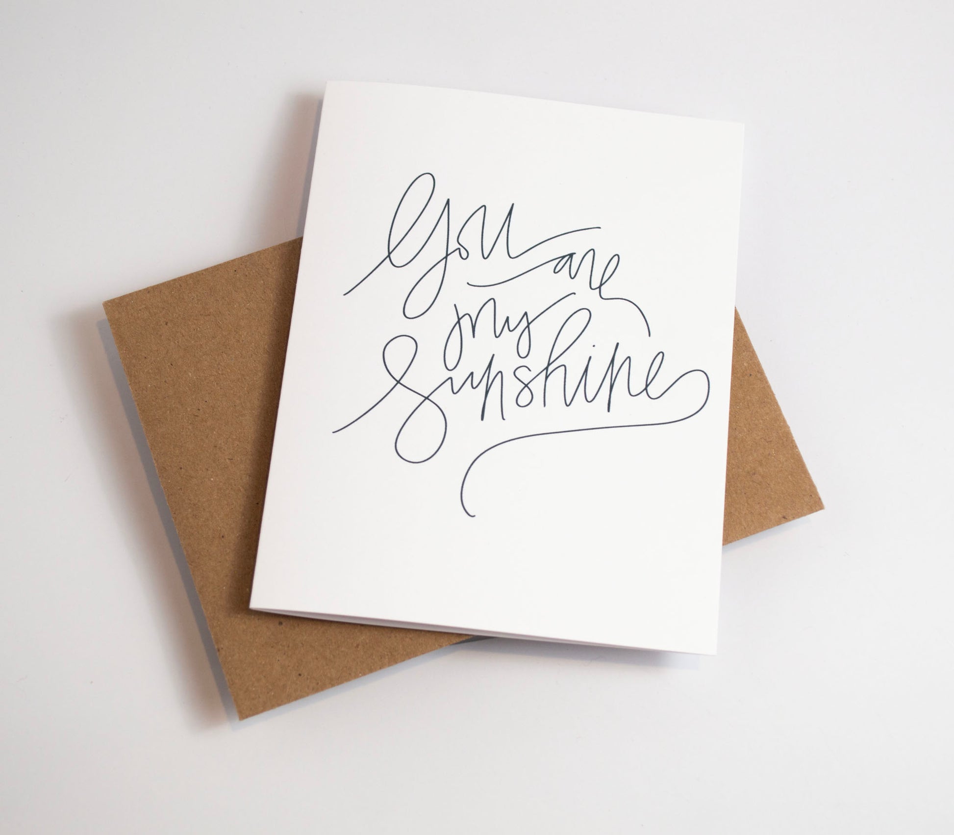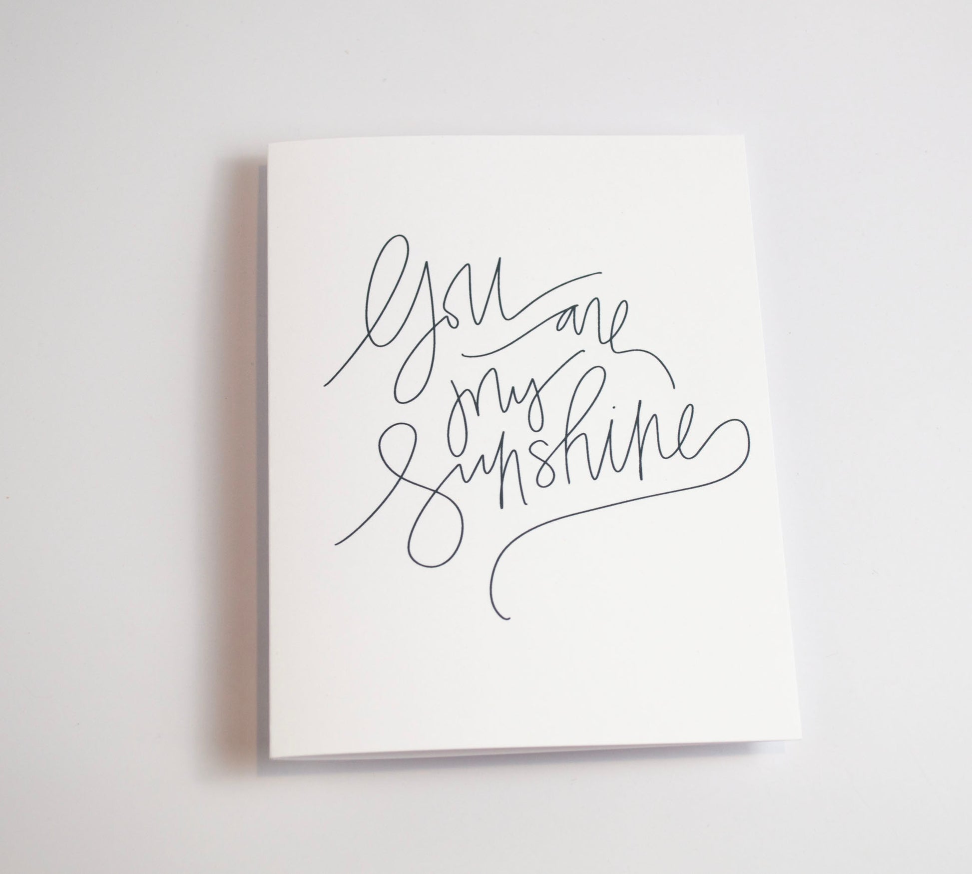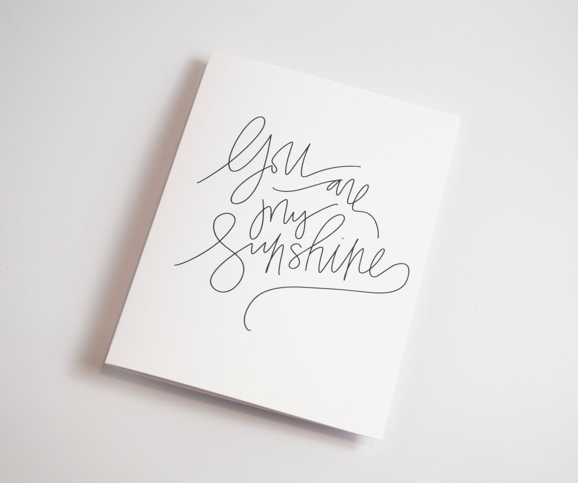 This item is a hand lettered greeting card in my signature woven lettered style. The front of the card reads "You Are My Sunshine" in bold, black ink. The inside of the card is blank for you to write your own message to your loved one. This card is printed on thick, smooth 110 lb card stock that feels both sturdy and luxurious in your hands.