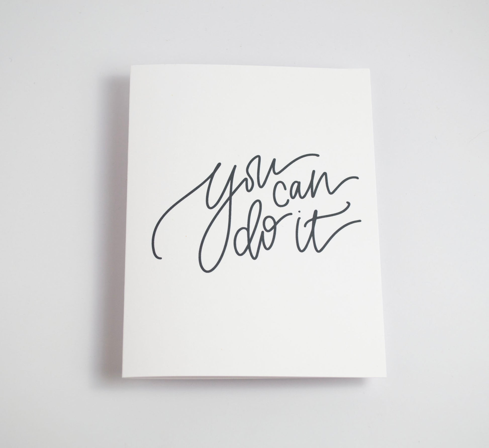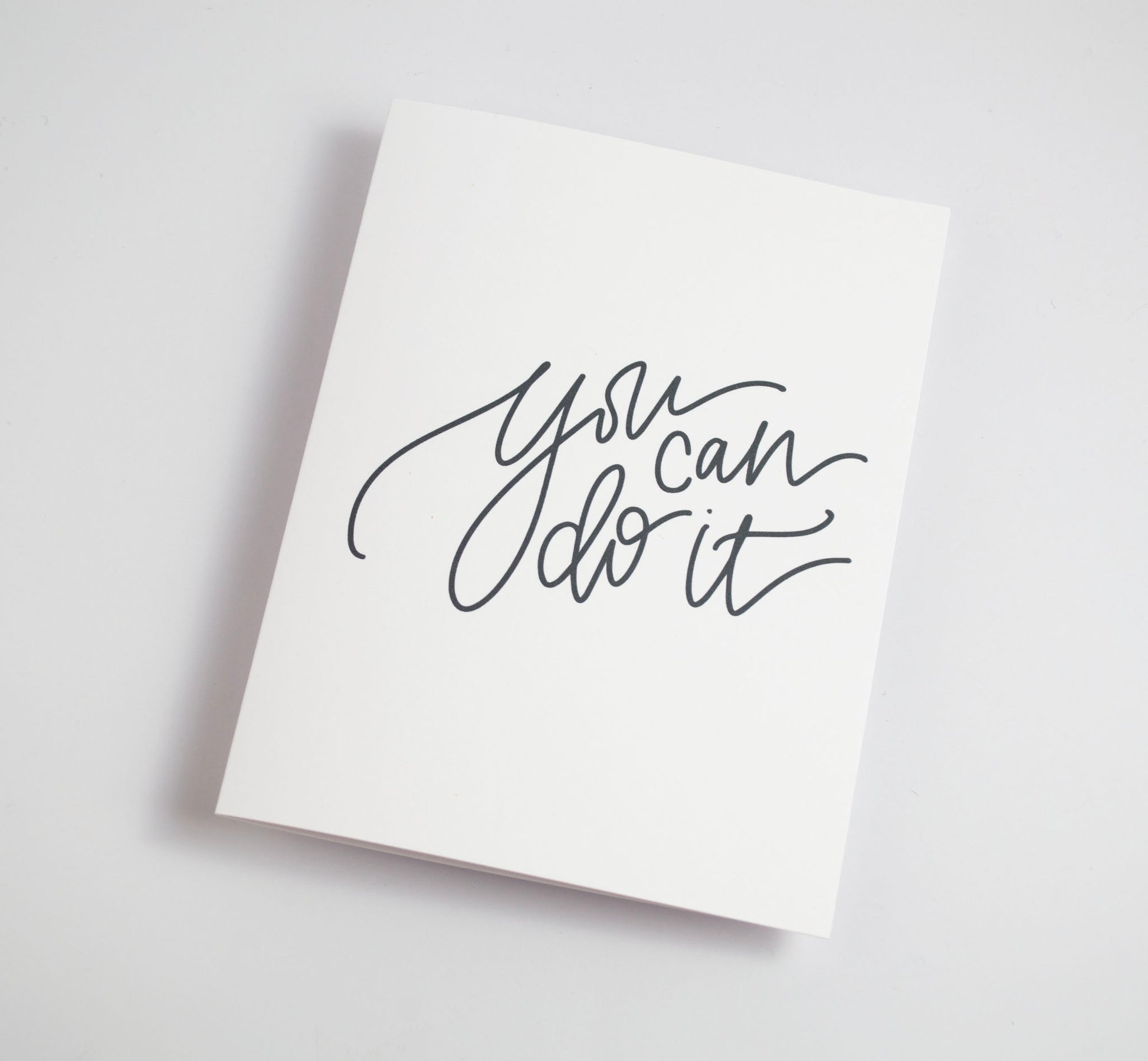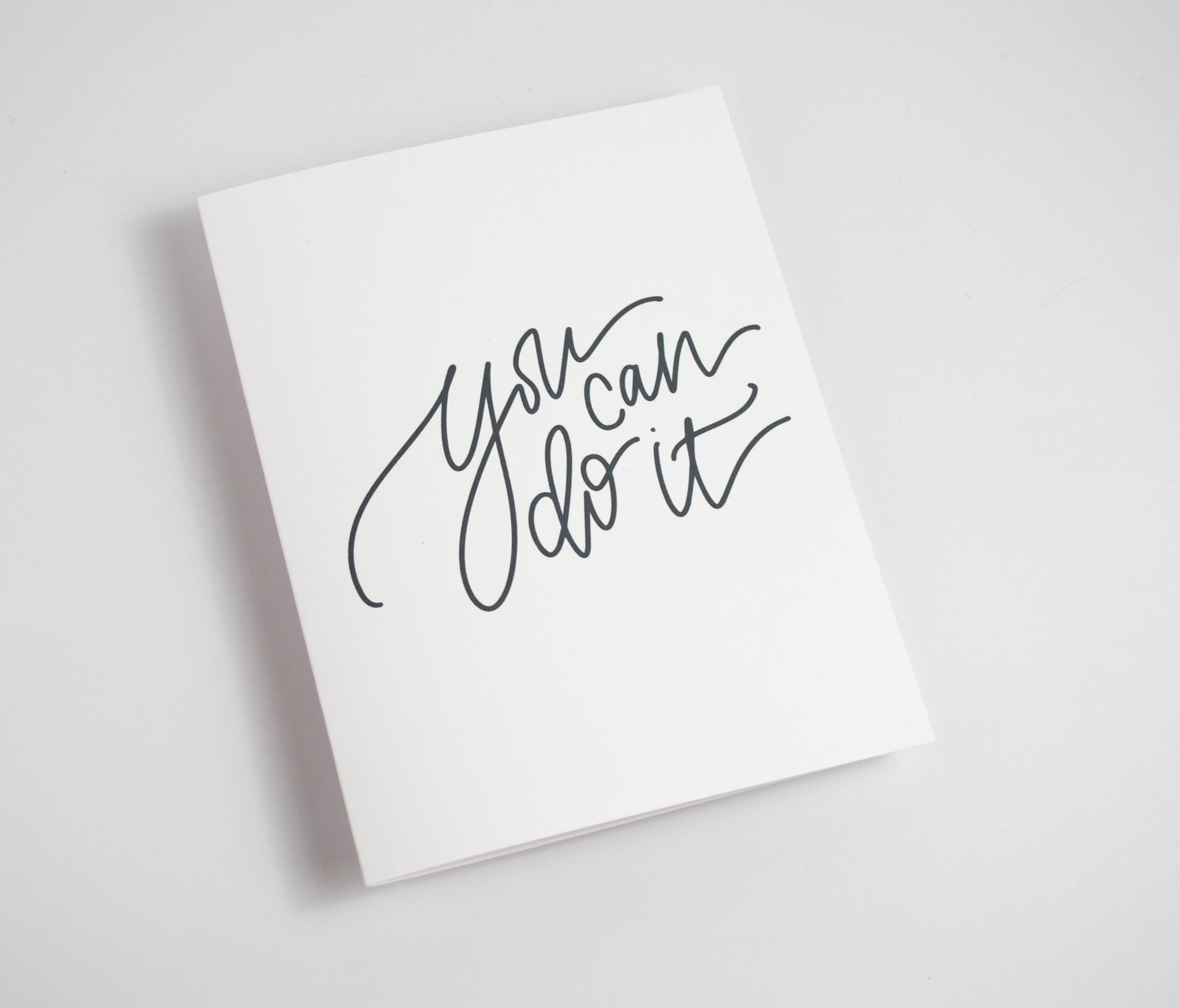 This item is a hand lettered greeting card in my signature woven lettered style. The front of the card simply reads "you can do it" in bold, black ink atop a white background. The inside of the card is blank for you to write your own message to the lucky recipient. This card is printed on thick, smooth 110 lb card stock that feels both sturdy and luxurious in your hands.