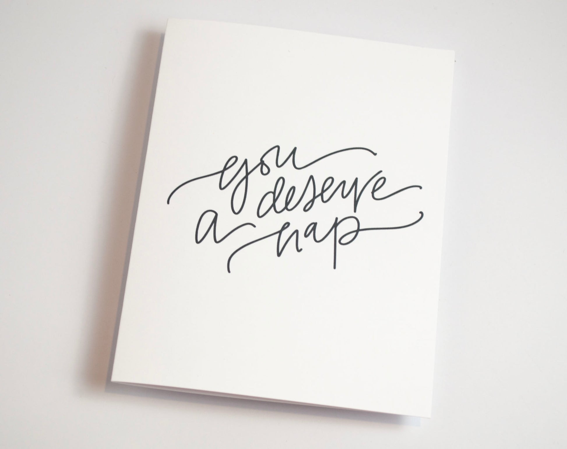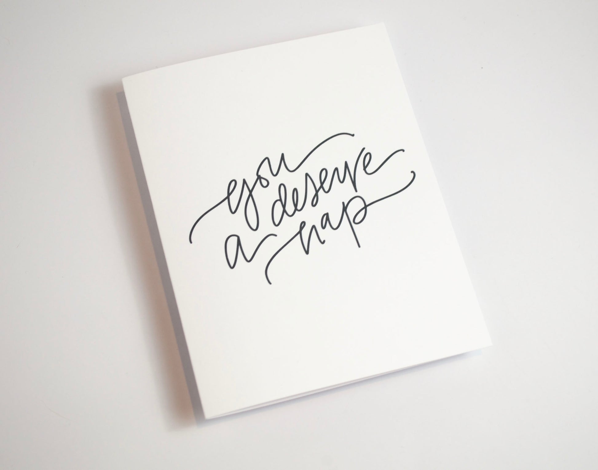 This item is a hand lettered greeting card in my signature woven lettered style. The front of the card reads "you deserve a nap" in bold, black ink atop a white background. The inside of the card is blank for you to write your own message. This card is printed on thick, smooth 110 lb card stock that feels both sturdy and luxurious in your hands.