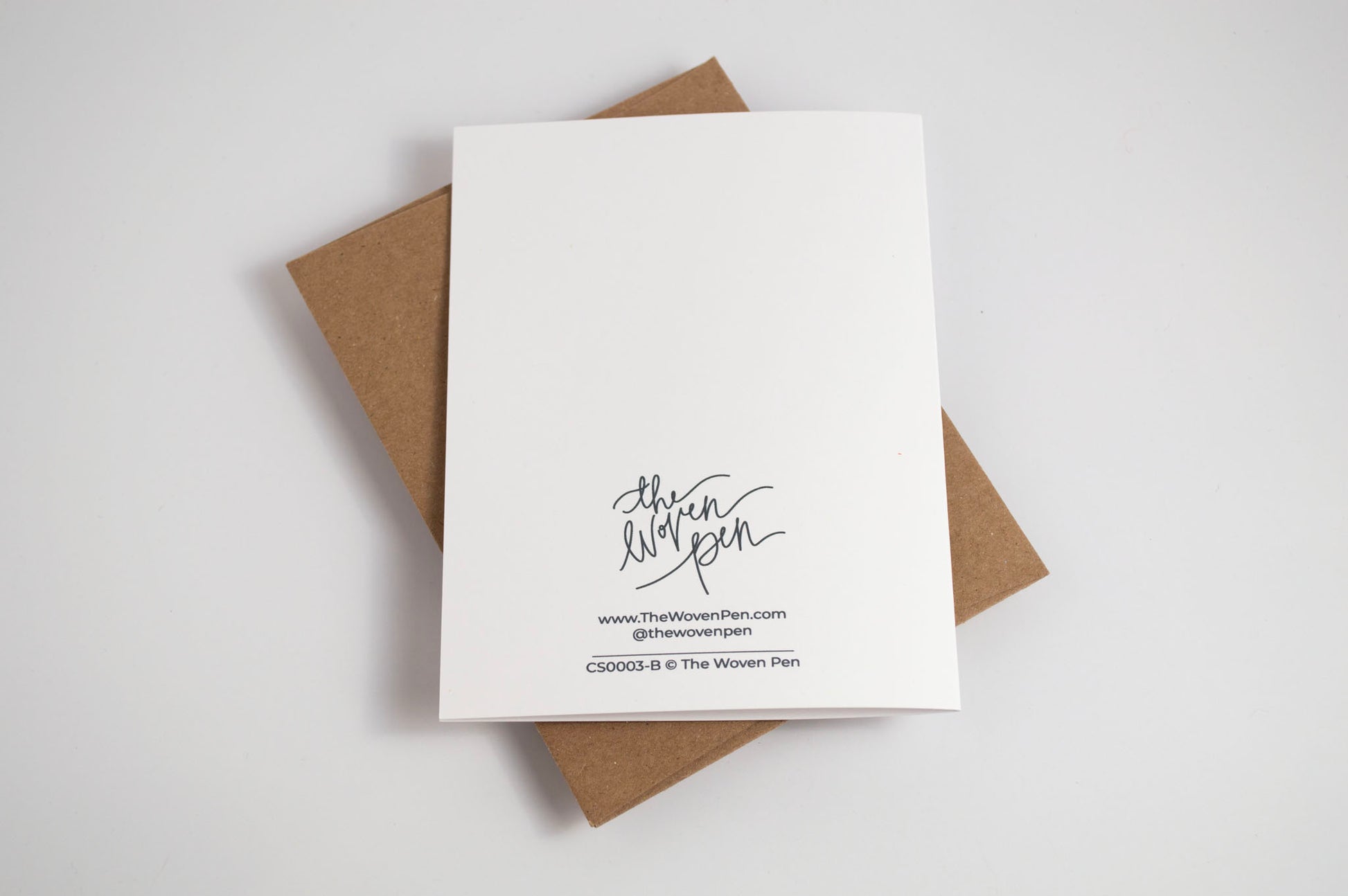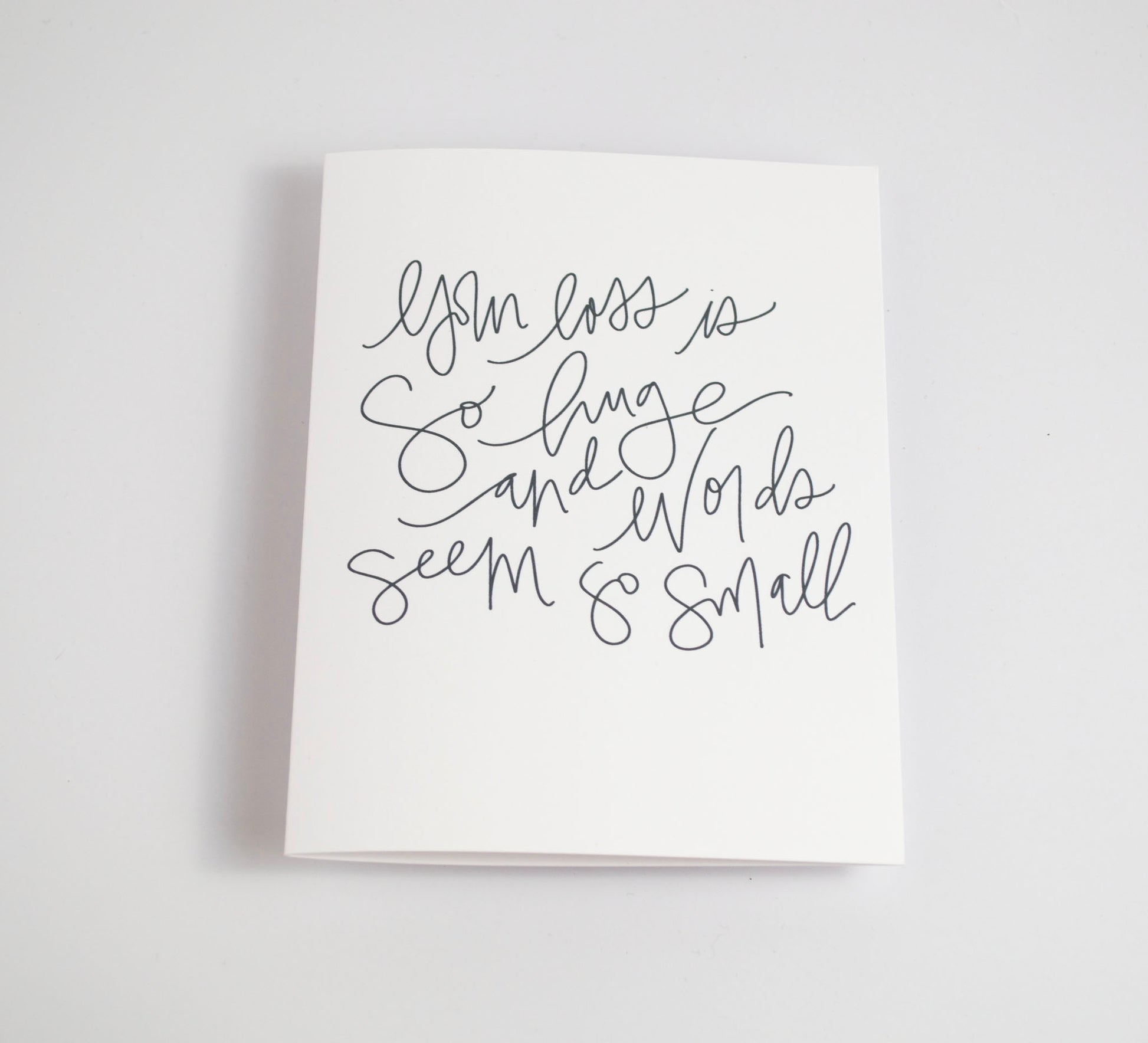 This item is a hand lettered greeting card in my signature woven lettered style. The front of the card reads "Your Loss Is So Huge and Words Seem So Small" in bold, black ink. The inside of the card is blank for you to write your own message. This card is printed on thick, smooth 110 lb card stock that feels both sturdy and luxurious in your hands.