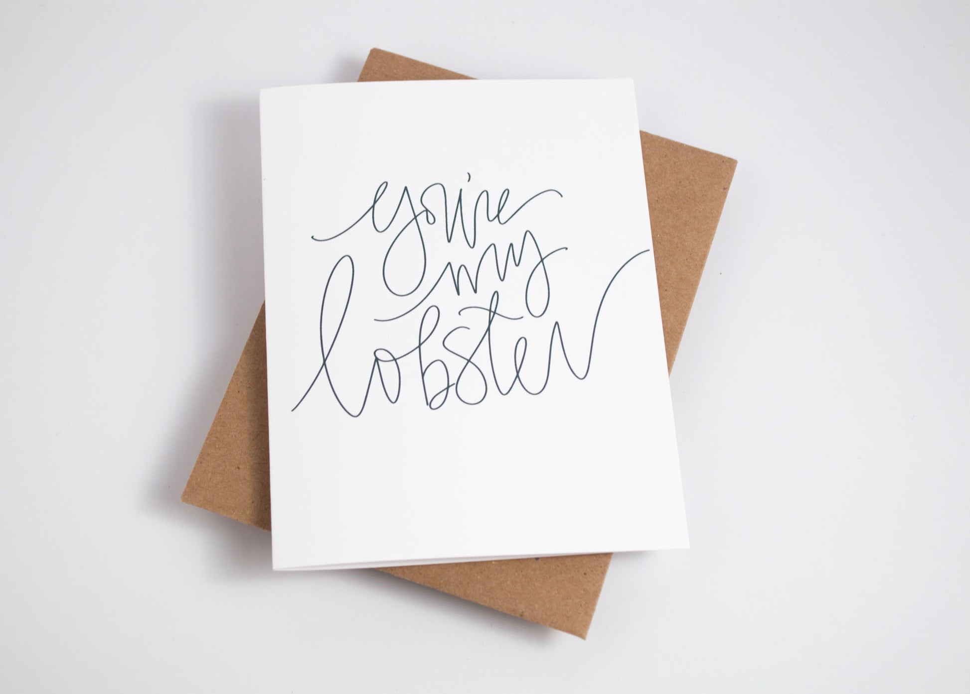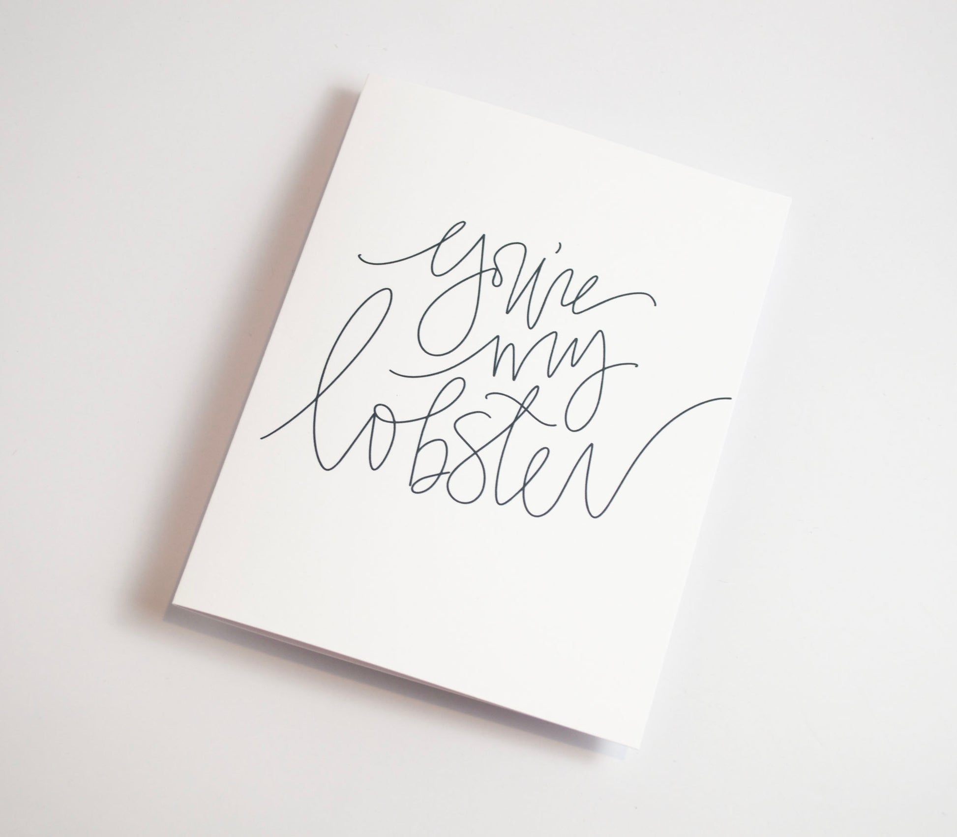 This item is a hand lettered greeting card in my signature woven lettered style. The front of the card simply reads "You're My Lobster" in bold, black ink. The inside of the card is blank for you to write your own message to your person. This card is printed on thick, smooth 110 lb card stock that feels both sturdy and luxurious in your hands.