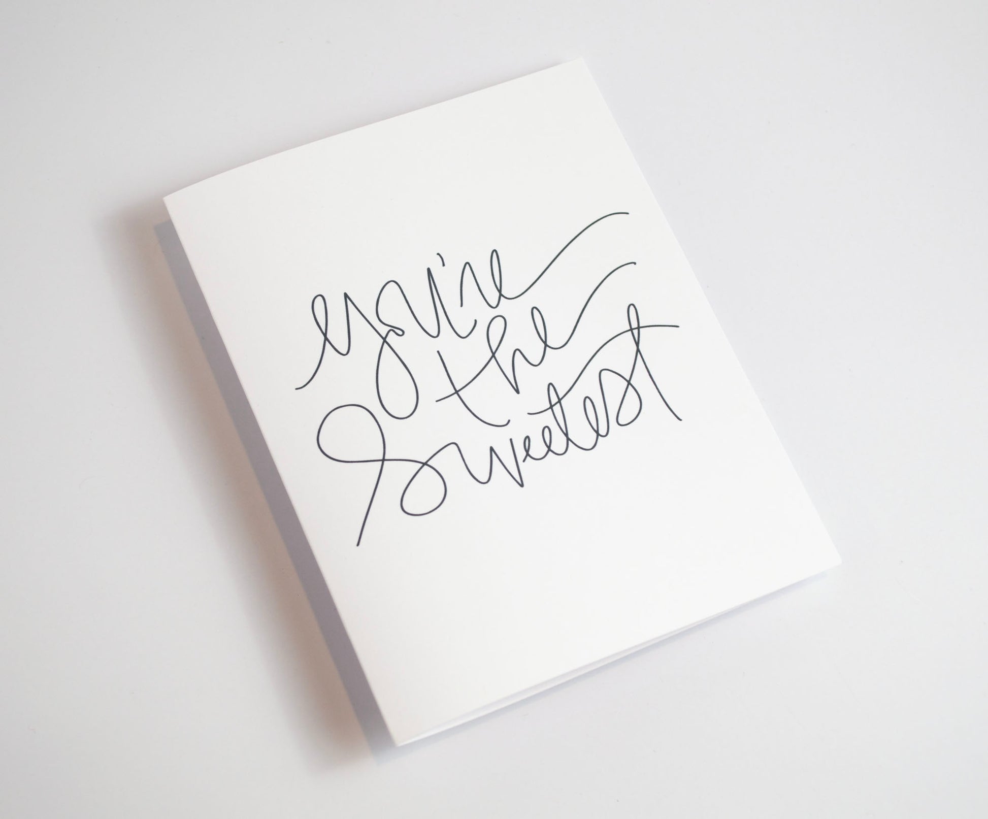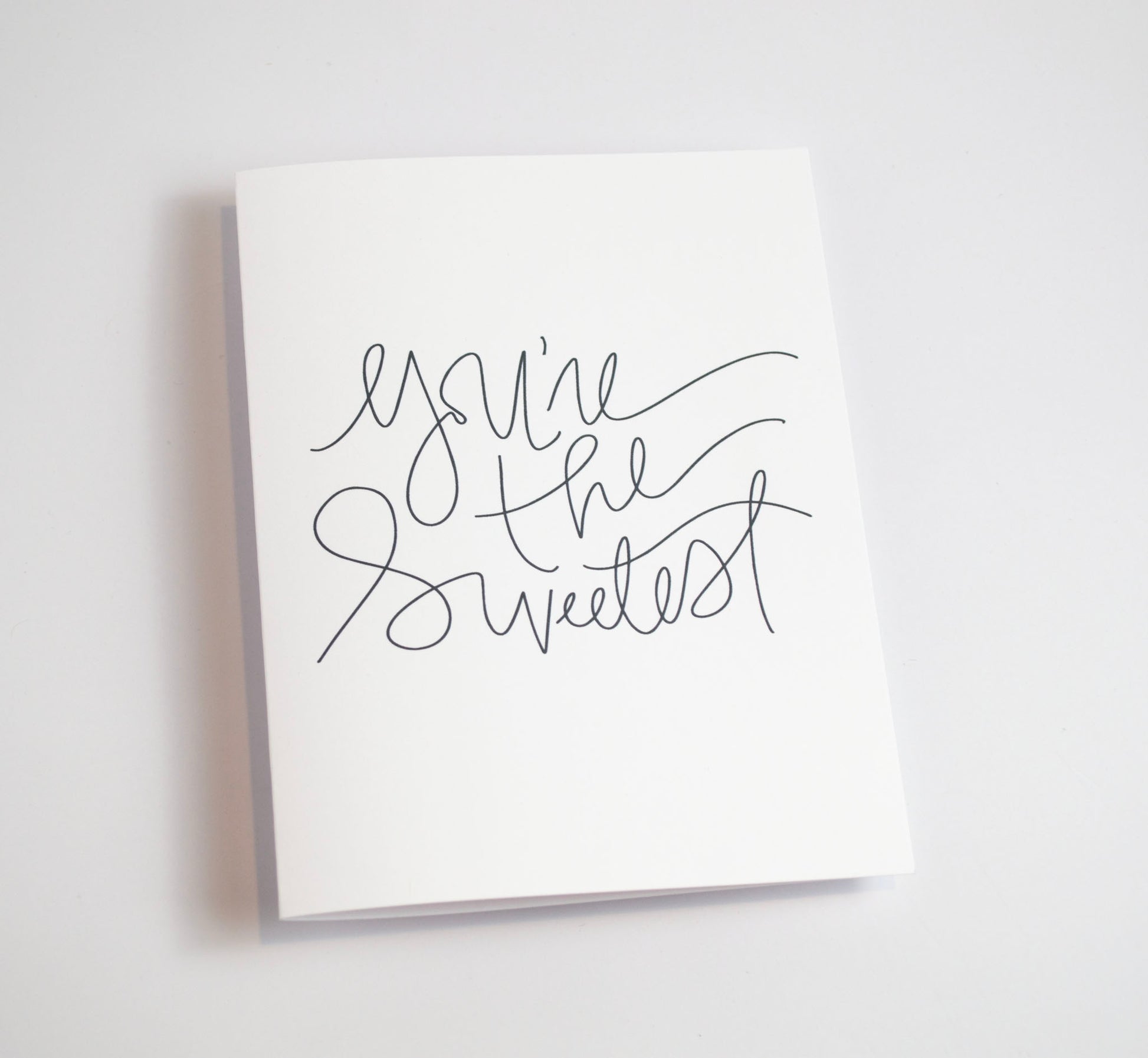 This item is a hand lettered greeting card in my signature woven lettered style. The front of the card simply reads "You're the Sweetest" in bold, black ink. The inside of the card is blank for you to write your own message to the lucky recipient. This card is printed on thick, smooth 110 lb card stock that feels both sturdy and luxurious in your hands.